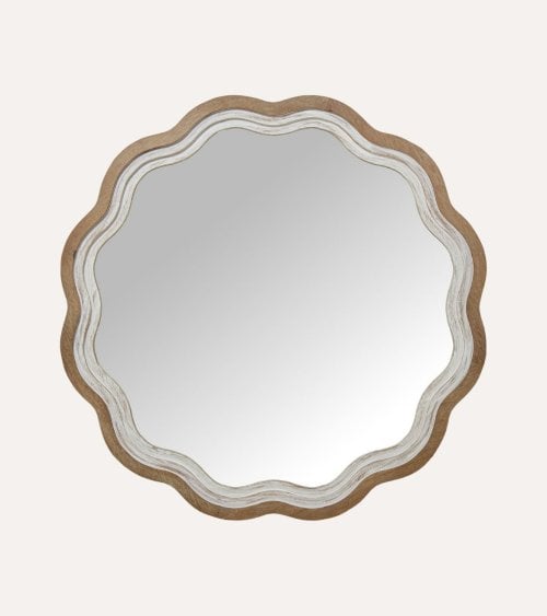 Este espejo de madera natural blanco de 80 x 80 x 4 cm, con un diámetro interior de 68 cm, es una pieza única. Su diseño de flor y acabado vintage...