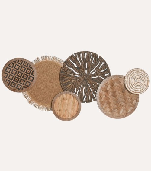 Esta decoración de pared combina círculos de rafia y MDF en una paleta de colores naturales, predominando tonos marrones claros, beiges y blancos...