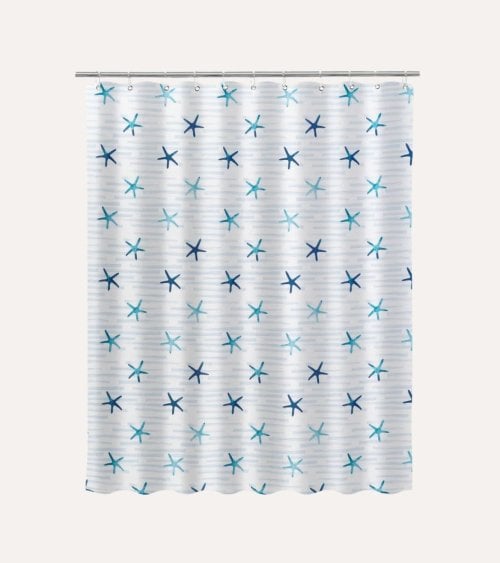 Esta cortina de baño de poliéster resistente al agua presenta un diseño de estrellas de mar en tonos turquesa y azul marino sobre un fondo blanco....