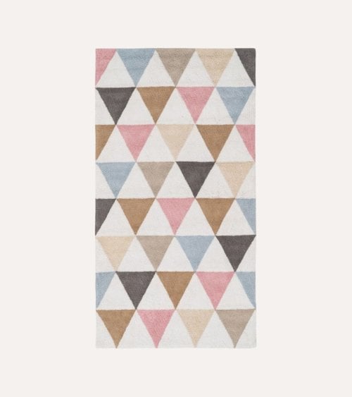 La Alfombra Infantil Geométrica de Algodón presenta un patrón geométrico de triángulos en tonos suaves como rosa, beige, azul claro y marrón,...