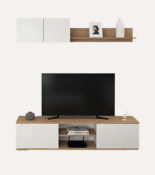 Este conjunto de salón minimalista de 2 piezas, compuesto por un mueble bajo con 2 puertas y huecos y un mueble alto colgado con 2 puertas, es...