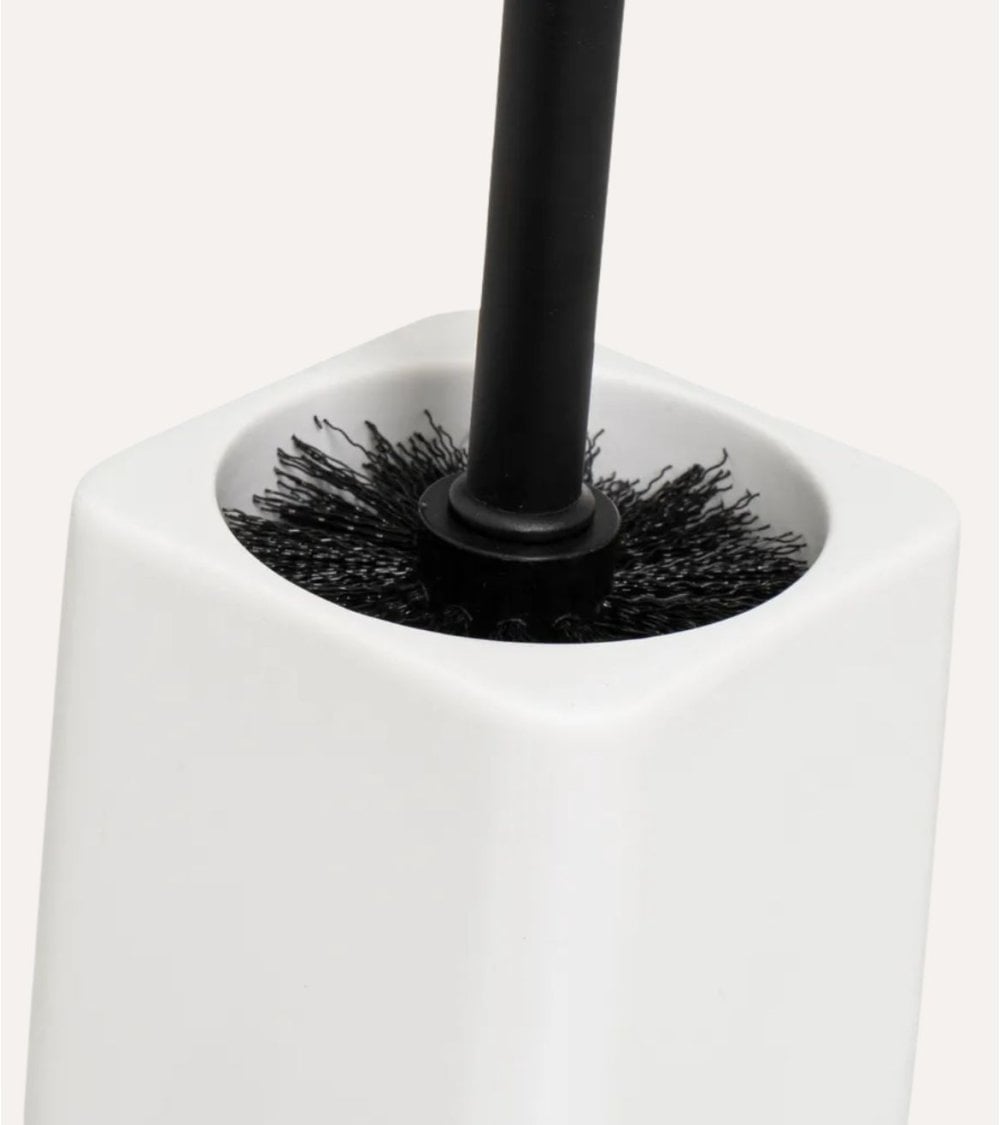 Esta escobilla destaca por su base cuadrada hecha en cerámica blanca, que aporta un toque sofisticado y minimalista a cualquier baño. Su superficie lisa y brillante facilita la limpieza del propio soporte, evitando acumulación de suciedad. El diseño compacto permite ubicarla fácilmente en espacios reducidos sin perder presencia visual.