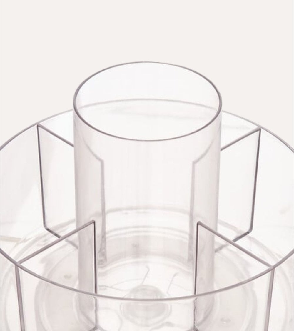 Fabricado en acrílico transparente, este organizador ofrece una resistencia superior y una apariencia limpia que se integra fácilmente en cualquier decoración. Su diseño giratorio permite acceder rápidamente a todos los compartimientos sin necesidad de mover el organizador completo, facilitando la selección de tus cosméticos favoritos.