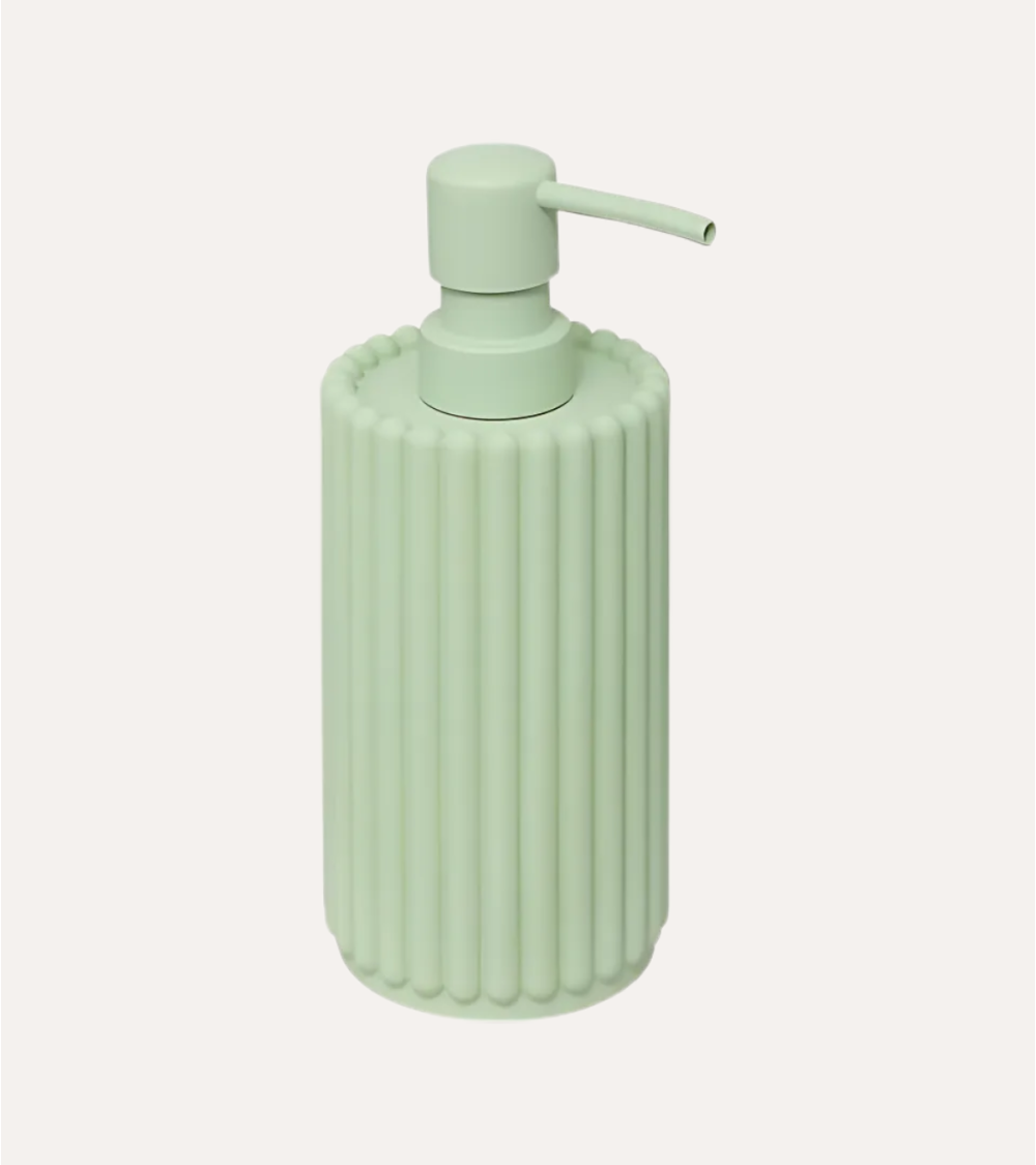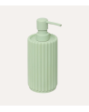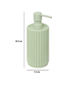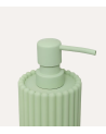 El Dispensador de Jabón BonBon se caracteriza por su forma cilíndrica y base ligeramente cónica, lo que le otorga una estética sofisticada. Su textura ribeteada, con surcos verticales uniformemente espaciados, no solo añade interés visual sino también una experiencia táctil única. La parte superior cuenta con un mecanismo de bomba que incluye una tapa redondeada y un nozzle delgado para facilitar la dispensación.