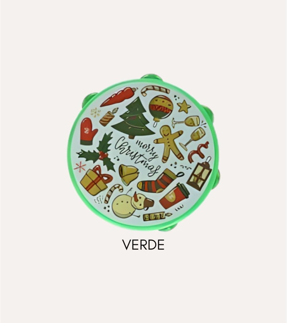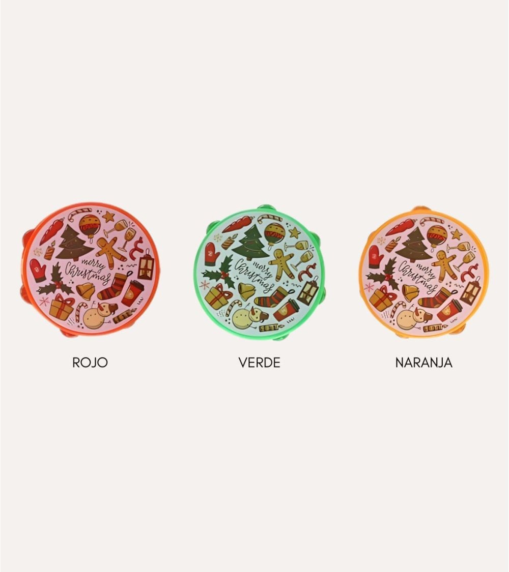 Esta pandereta destaca por su estructura de plastico. Además, incorpora platos de metal que aportan ligereza y comodidad al momento de tocarla. Su diseño presenta un estampado navideño colorido y detallado, con motivos clásicos como árboles de Navidad, estrellas y copos de nieve, que capturan perfectamente el ambiente festivo.