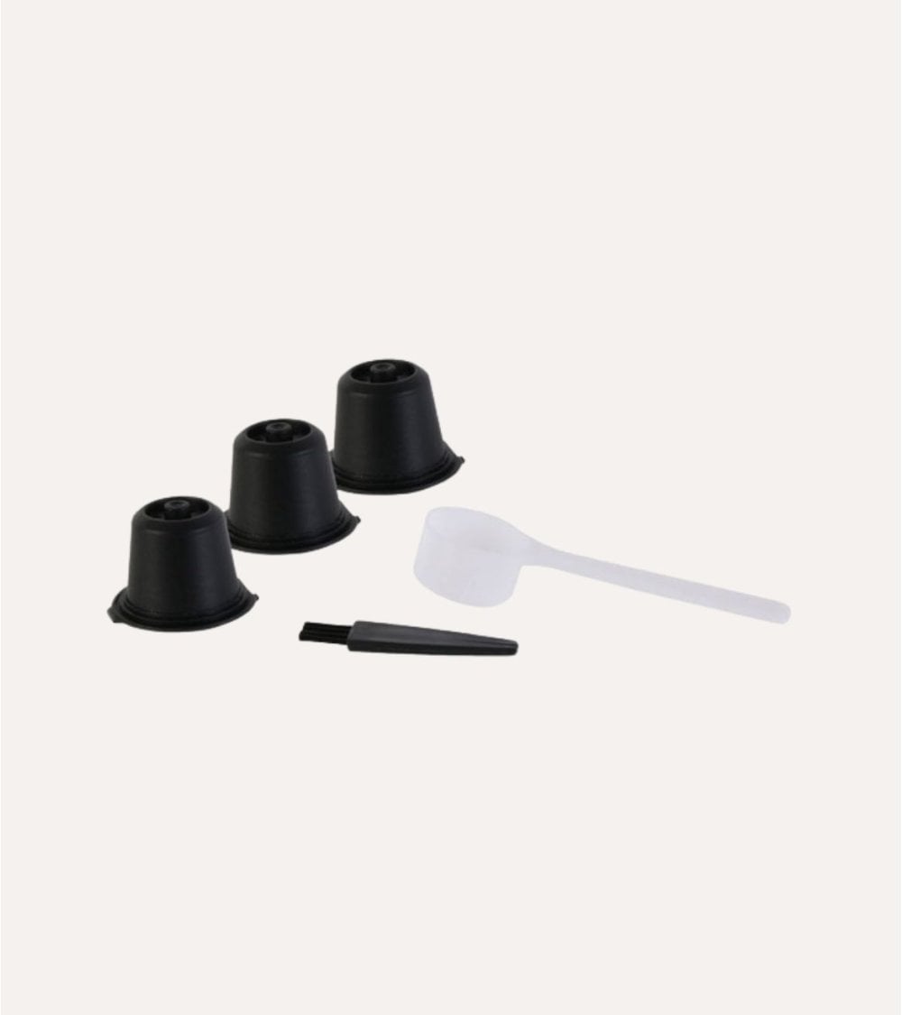 Cada set incluye tres cápsulas reutilizables, ideales para preparar diferentes variedades o intensidades según tu preferencia personal. Además, su acabado negro mate aporta un toque moderno y elegante a tu rutina diaria del café.