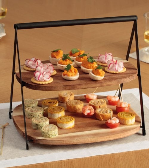 - Bandejas ovaladas: Dos niveles amplios hechos en madera natural de acacia.
