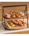 Este expositor no solo es práctico sino también estéticamente atractivo. Cada bandeja tiene una forma ovalada con bordes ligeramente elevados que facilitan la colocación segura de objetos variados como frutas, pasteles, quesos o incluso elementos decorativos. La madera presenta vetas naturales y franjas horizontales claras que realzan su textura única.