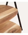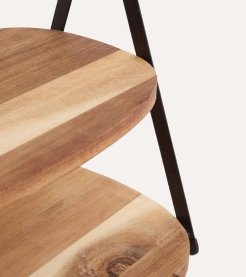 Su diseño moderno se basa en una estructura robusta fabricada en metal negro con acabado resistente, que garantiza estabilidad y durabilidad. Los dos niveles están elaborados con madera natural de acacia, reconocida por su belleza y resistencia, aportando un toque cálido y rústico que contrasta armoniosamente con el metal.