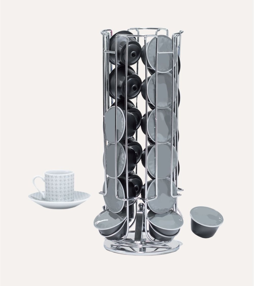 Su estructura metálica de alta calidad garantiza una larga vida útil, resistiendo al uso diario y conservando su brillo con un mantenimiento mínimo. Gracias a su diseño giratorio de 360º, puedes ver y seleccionar tus cápsulas de café de un solo vistazo, optimizando el espacio en la encimera y aportando un toque de estilo profesional. Además, su formato compacto y vertical lo convierte en una solución perfecta para superficies reducidas, ayudándote a aprovechar al máximo cada centímetro.