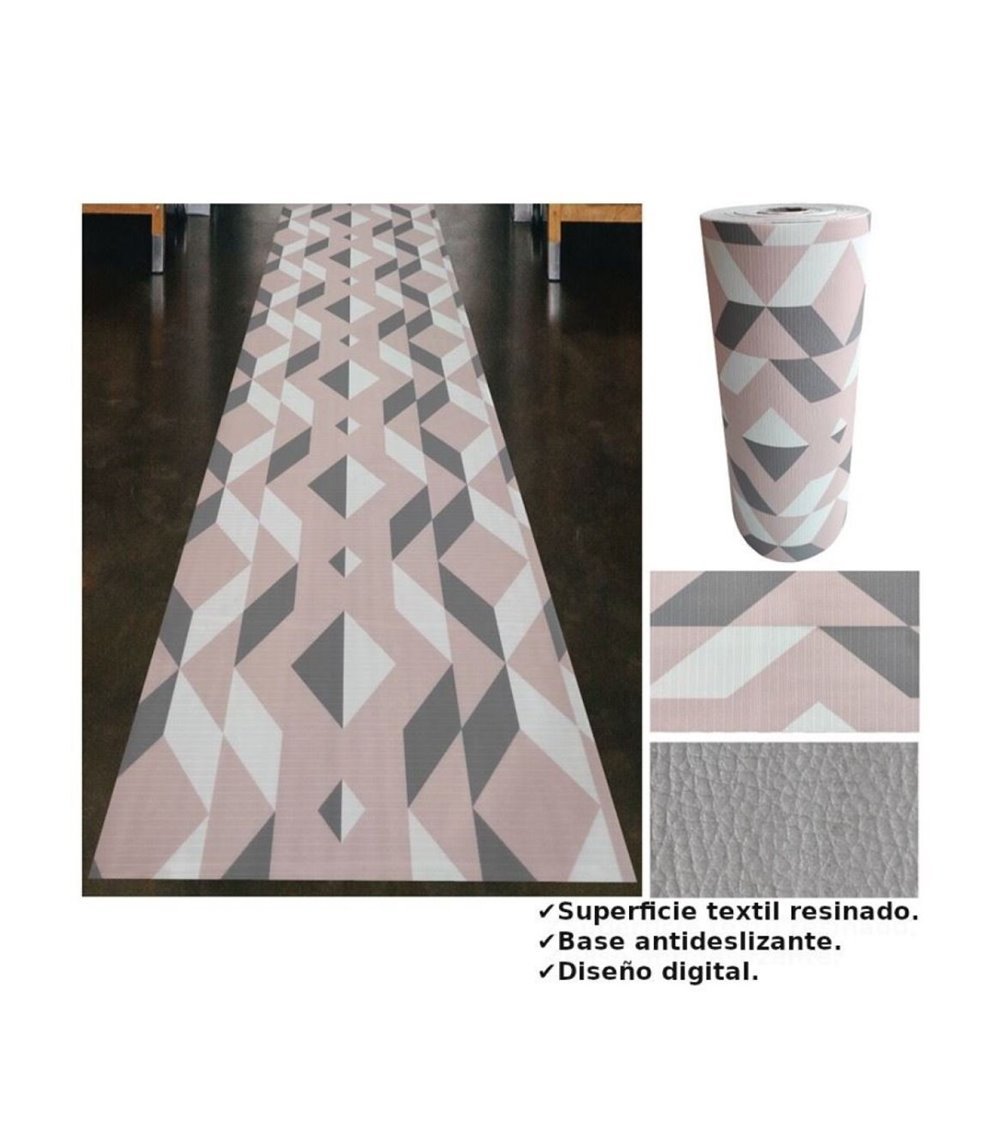Alfombra multiusos al corte con un ancho de 52 cm y un diseño estampado en tonos rosas, grises y blanco.