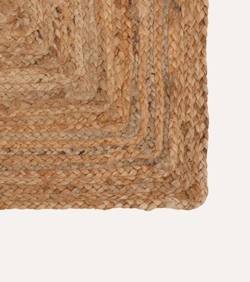Fabricada con yute 100% natural, esta alfombra destaca por su resistencia y durabilidad, ideal para soportar el uso diario sin perder su encanto. Su textura gruesa y tejida a mano ofrece una sensación auténtica y cálida bajo los pies, mientras que su diseño en tonos marrones naturales con patrones rectangulares concéntricos añade profundidad visual y elegancia discreta.