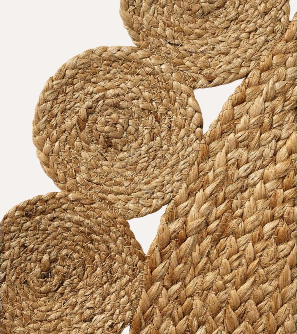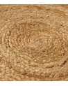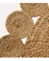 Con un diseño circular y un diámetro disponible en dos tamaños, pequeño y grande, esta alfombra se adapta perfectamente a diferentes ambientes, desde espacios reducidos hasta áreas más amplias. Su tejido en yute natural aporta una textura cálida y resistente, mientras que el ribete con detalles redondeados añade un acabado decorativo que realza su belleza artesanal.
