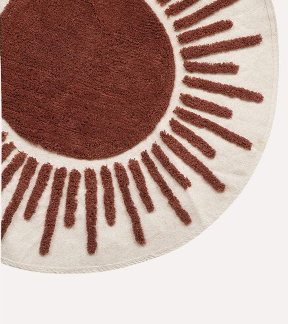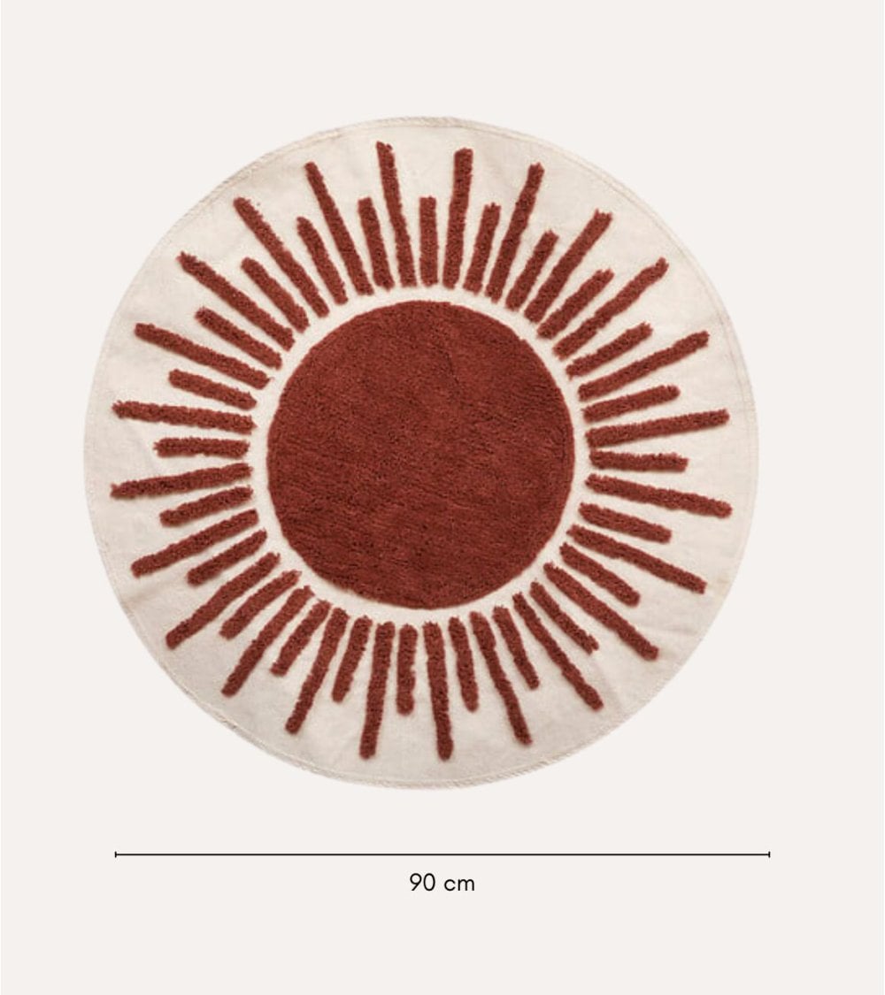 Fabricada en algodón, esta alfombra ofrece una textura suave y duradera, ideal para áreas de alto tráfico. Su colorido diseño presenta un sol central en un tono rojizo-marrón, que contrasta maravillosamente con el fondo crema. Este esquema de colores no solo añade interés visual, sino que también evoca sensaciones de energía y vitalidad.