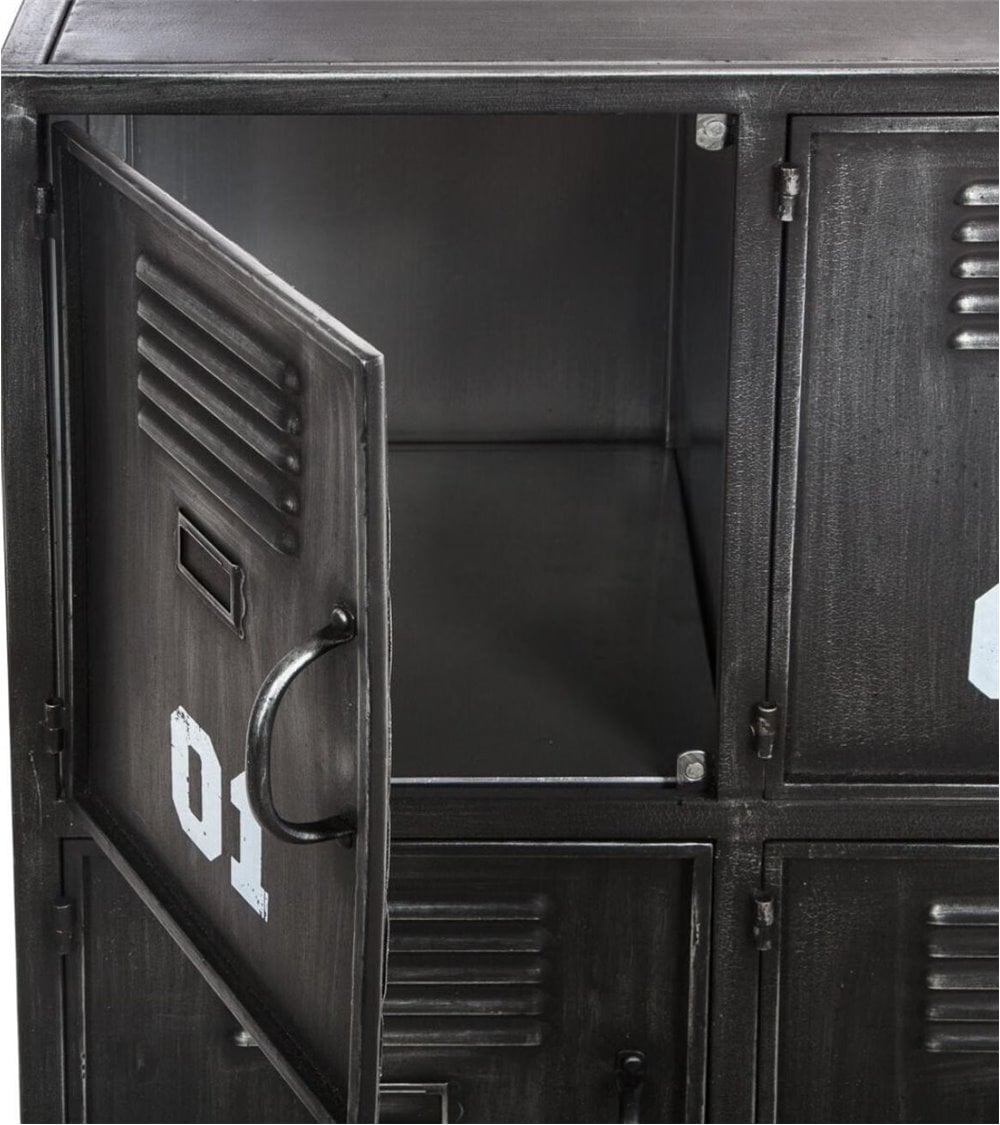 El Aparador metálico con 6 puertas en color negro desgastado es un mueble con un diseño único que simula una taquilla. Cada puerta tiene su propia numeración, aportando un toque de estilo industrial. Con medidas aproximadas de 90 x 35 x 88,5 cm, este aparador ofrece un amplio espacio de almacenaje en su interior. Fabricado en hierro, garantiza durabilidad y resistencia. Ideal para los amantes del diseño industrial.