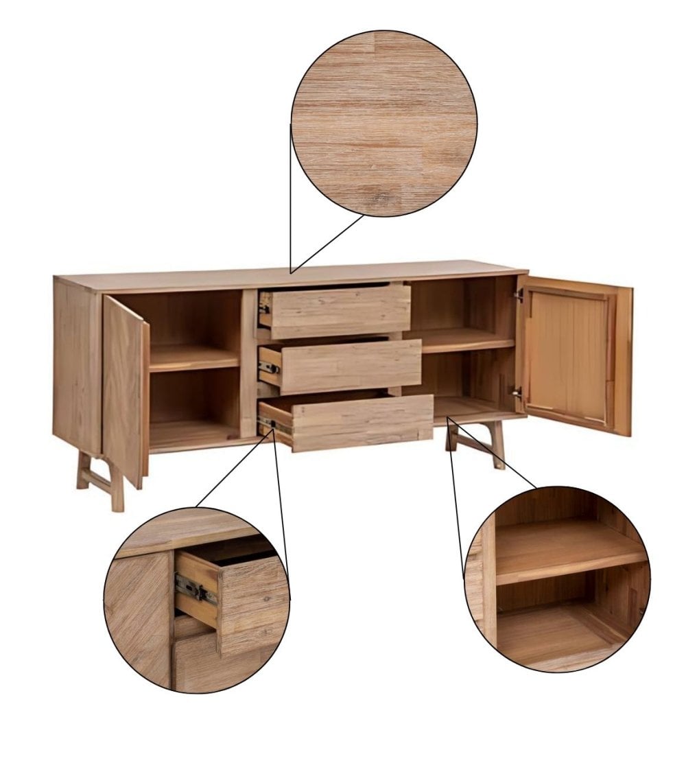 - Este aparador cuenta con dos puertas y tres cajones, ofreciendo un amplio espacio de almacenamiento para tus objetos personales.