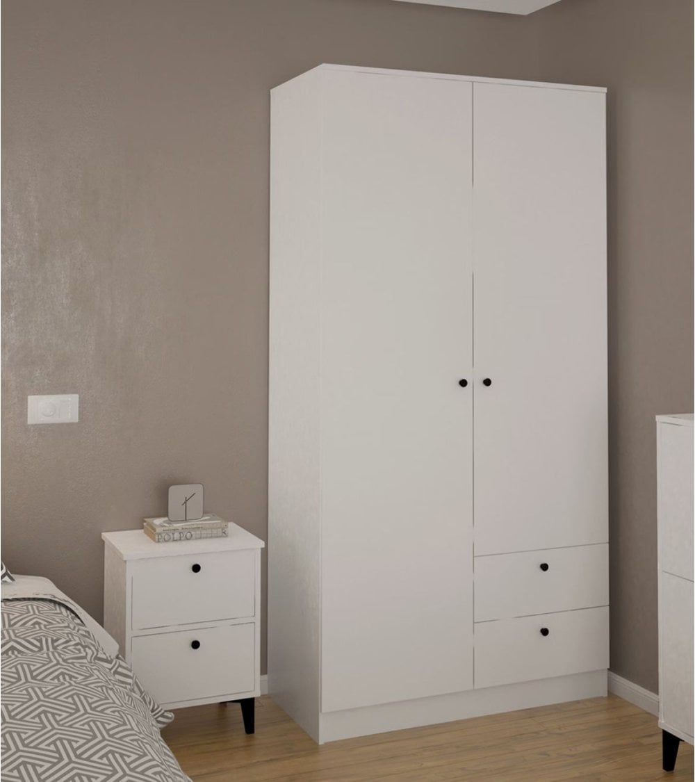 Este armario está elaborado en melamina, un material resistente que garantiza durabilidad y fácil mantenimiento. Su acabado liso y mate aporta un toque contemporáneo, mientras que su color blanco neutro facilita la integración en diversos estilos decorativos, desde minimalistas hasta escandinavos.