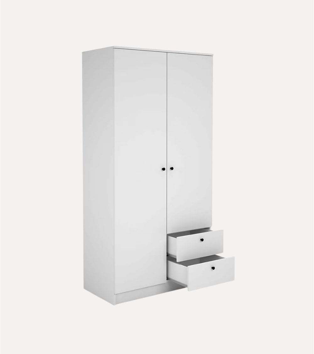 Este armario es ideal tanto para dormitorios principales como infantiles gracias a su versatilidad y diseño atemporal. Además, su combinación de puertas abatibles junto a múltiples cajones ofrece soluciones prácticas para mantener todo organizado al alcance de la mano.
