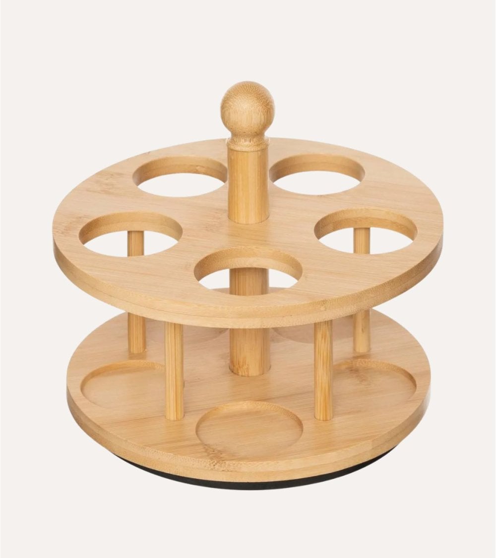 Su estructura circular está fabricada en bambú, un material sostenible que aporta calidez y resistencia. Los cinco botes de cristal, distribuidos uniformemente alrededor de la base, permiten visualizar fácilmente el contenido, facilitando su uso diario. Cada bote cuenta con una tapa también elaborada en bambú, diseñada para un cierre seguro y una manipulación sencilla.
