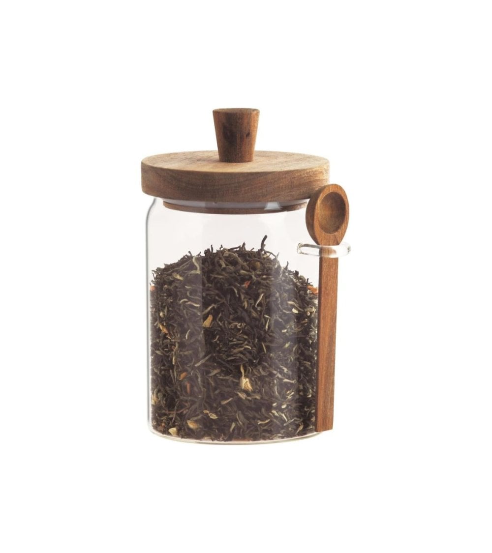 Bote elaborado con una estructura de vidrio transparente y tapa de madera de acacia con cuchara en color natural.