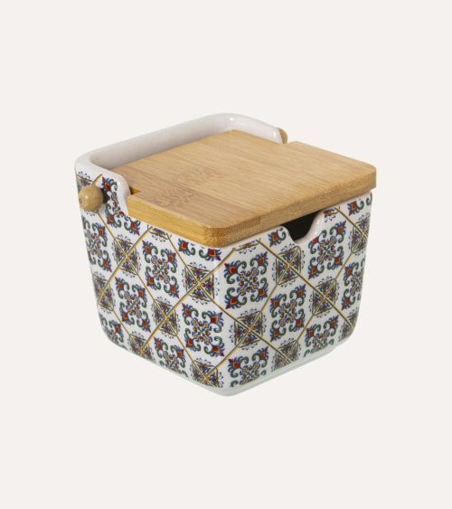 - Tapa de madera (bambú) que protege el contenido de la humedad y conserva mejor la sal.