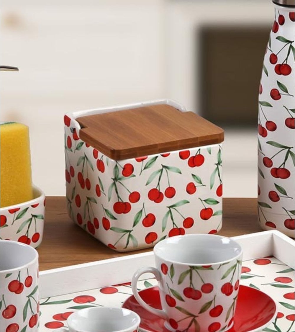 Su cuerpo de cerámica blanca de acabado brillante está decorado con un atractivo diseño de cerezas rojas y hojas verdes, ideal para cocinas de estilo moderno, vintage o rústico. La tapa de madera aporta un contraste natural y ayuda a proteger la sal u otras especias del polvo y la humedad, manteniendo el contenido siempre fresco. Es un complemento perfecto para quienes buscan organizadores de cocina con estilo sin renunciar a la practicidad.