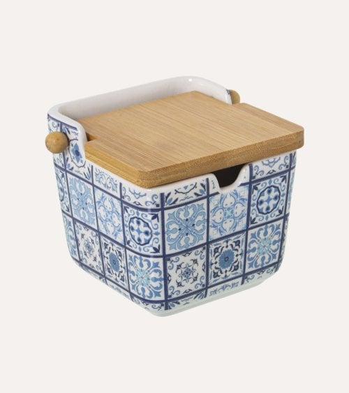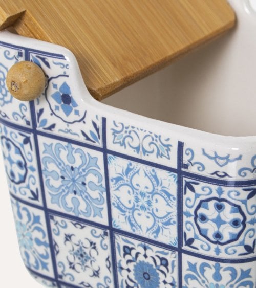 El Azucarero Lisboa de Cerámica está hecho de cerámica de alta calidad, lo que garantiza su durabilidad y resistencia. Además, viene con una tapa de madera que no solo complementa su diseño, sino que también mantiene el azúcar fresco y seco. Este azucarero está disponible en dos modelos: azulejos multicolor o azulejos azules y blancos, lo que te permite elegir el que mejor se adapte a tu decoración.