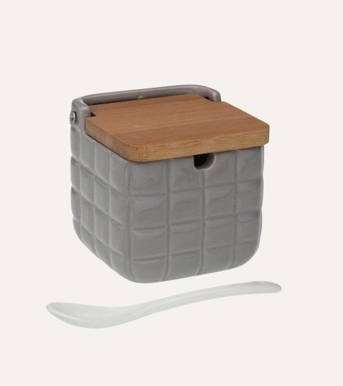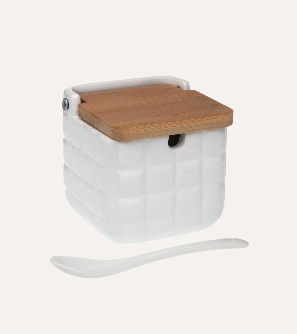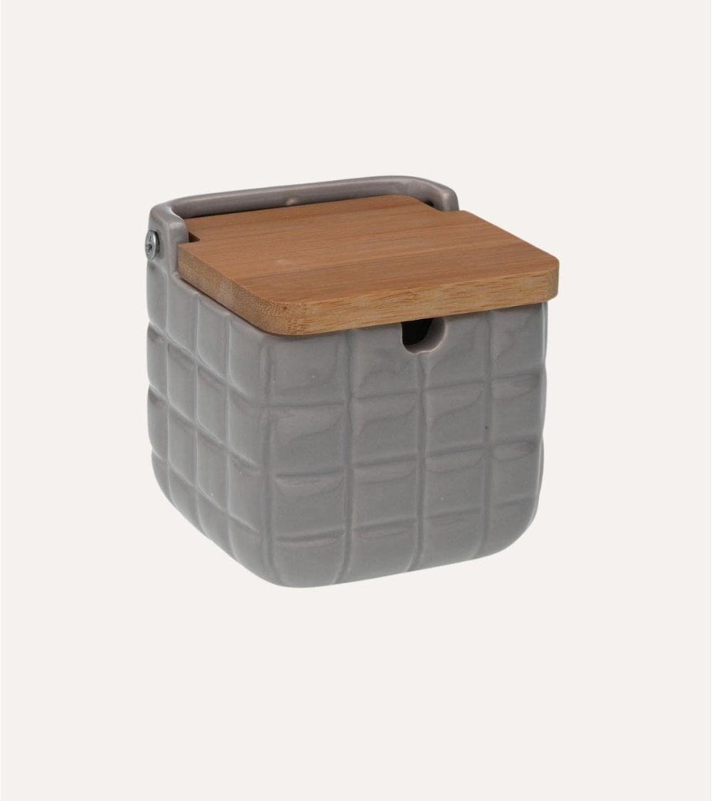 Este azucarero a cuadros con tapa de bambú es una pieza esencial para tu cocina. Hecho de dolomita, tiene medidas de 8.3 x 8.3 x 8.3 cm. Su diseño presenta cuadritos tallados sobre la superficie, aportando un toque creativo a su apariencia minimalista. Disponible en blanco o gris, este azucarero combina funcionalidad y estilo.