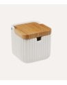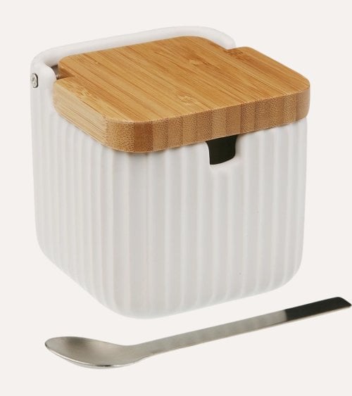 Este azucarero de cerámica de color blanco presenta un elegante diseño de rayas verticales. Viene con una cuchara de metal para facilitar el uso. Su tapa de bambú añade un toque de sofisticación y protege el azúcar de la humedad. Sus medidas son 9 x 9.5 x 11 cm, lo que lo hace perfecto para cualquier cocina.