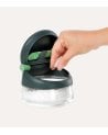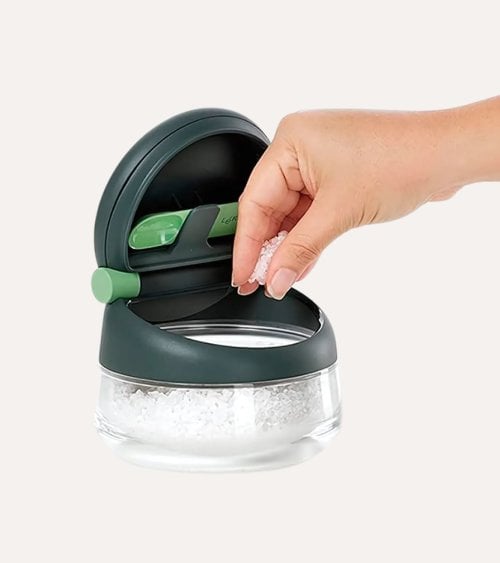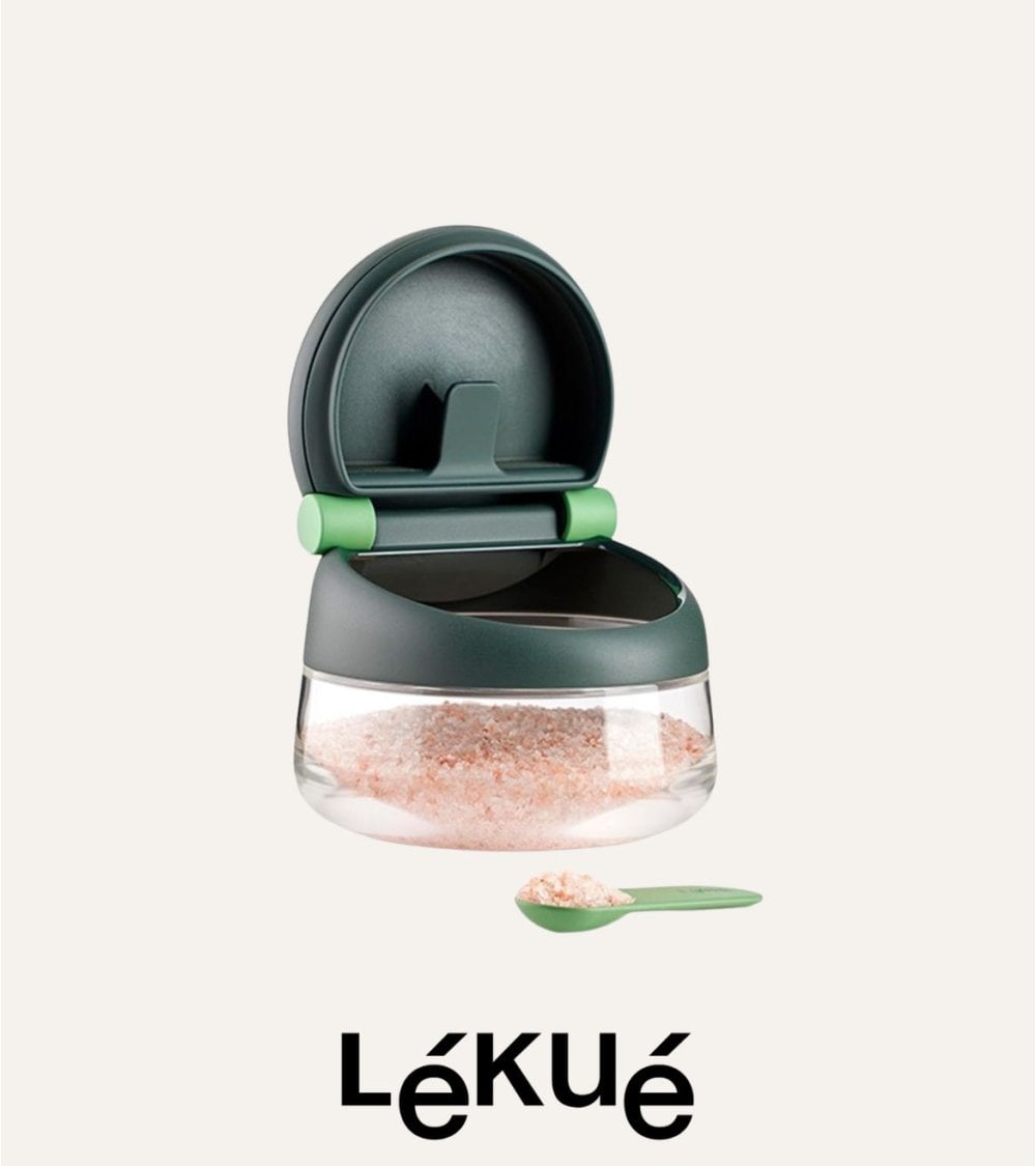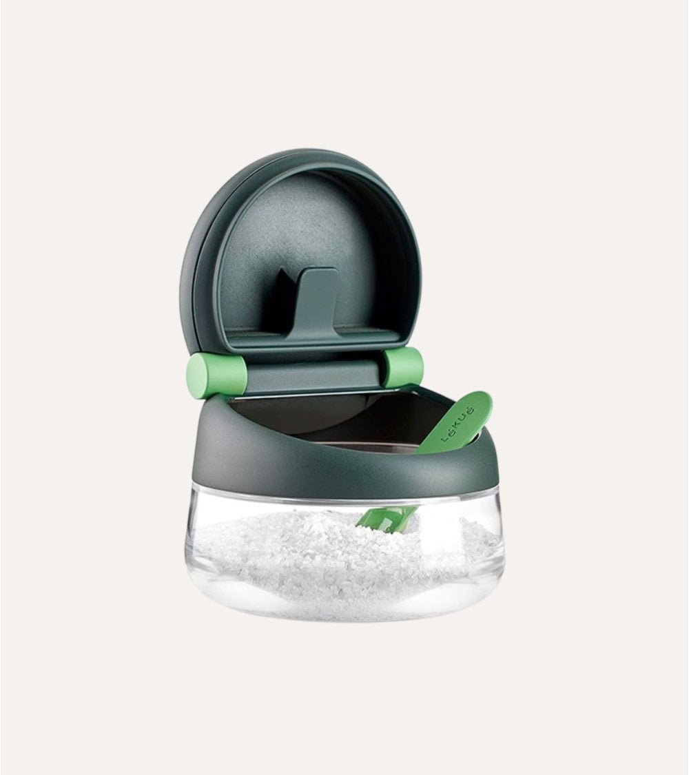 El mecanismo del tapa con bisagra, acompañado por una pequeña cucharita verde, asegura un acceso fácil y rápido al contenido. Además, incluye una cucharita a juego que hace que servir la sal sea aún más sencillo. Este diseño moderno se adapta perfectamente a cualquier decoración contemporánea.