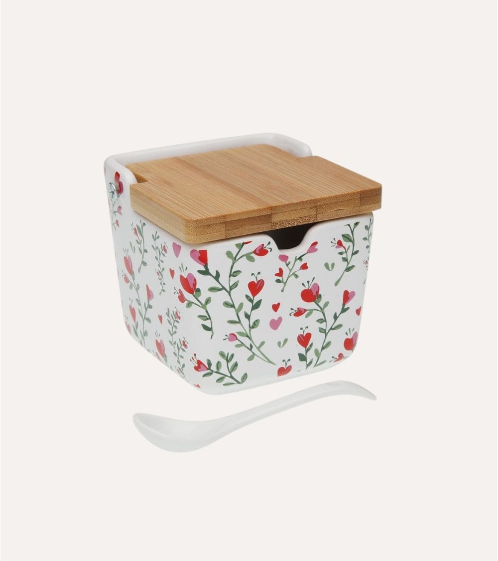 La parte exterior del Azúcarero Lover presenta un fondo blanco adornado con un intrincado patrón floral que incluye tonos vibrantes de rojo y rosa, junto con hojas verdes y pequeños motivos en forma de corazón. Este diseño no solo es visualmente atractivo, sino que también añade un aire romántico a tus comidas diarias o celebraciones especiales.