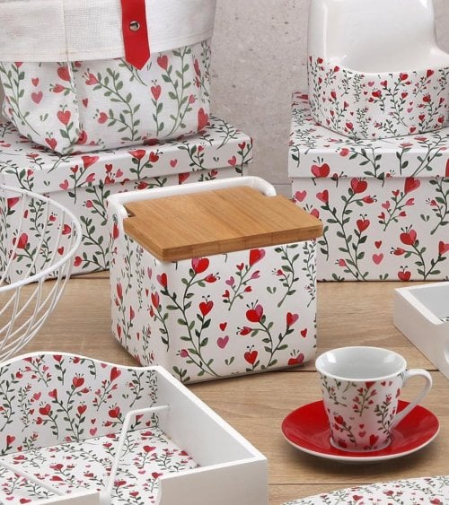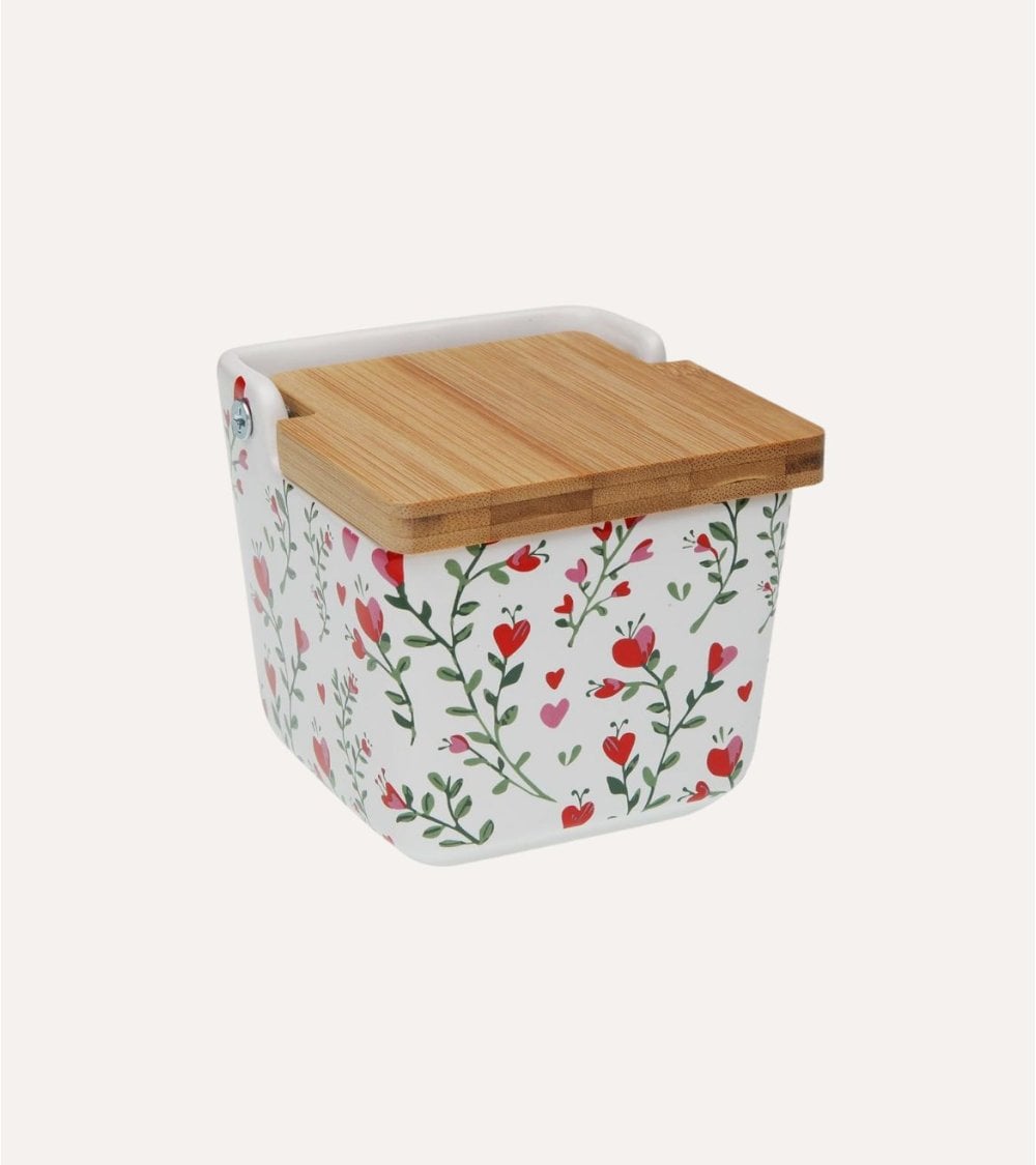El recipiente presenta un motivo botánico caprichoso, mostrando vibrantes corazones rojos y flores entrelazadas con exuberantes hojas verdes. Este diseño añade un toque de romance a tu espacio culinario, haciéndolo perfecto para aquellos que aprecian tanto el estilo como la practicidad.