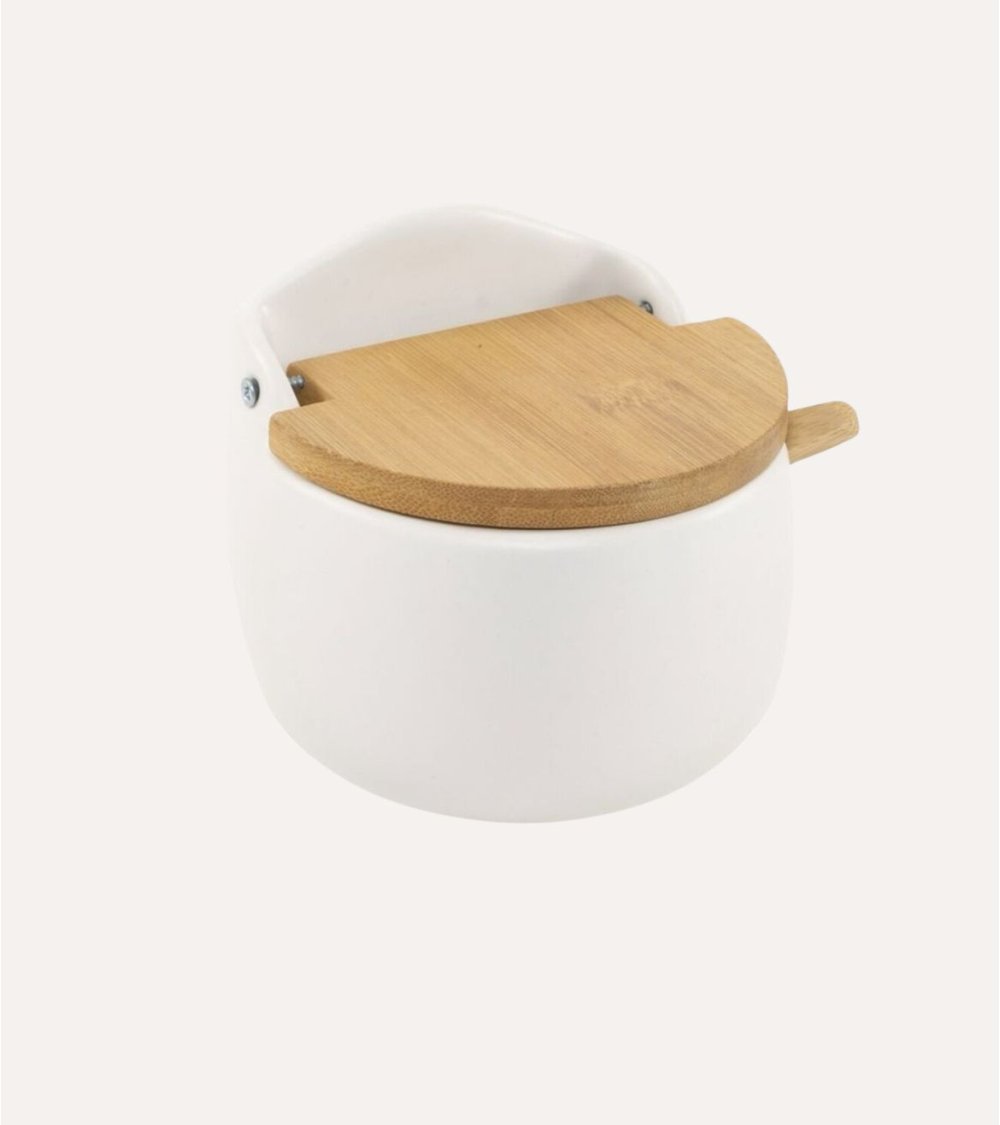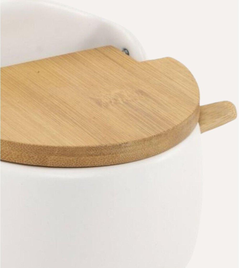 - Tapa de bambú: La tapa está hecha de bambú sostenible, aportando un contraste cálido y natural al diseño contemporáneo del azucarero.