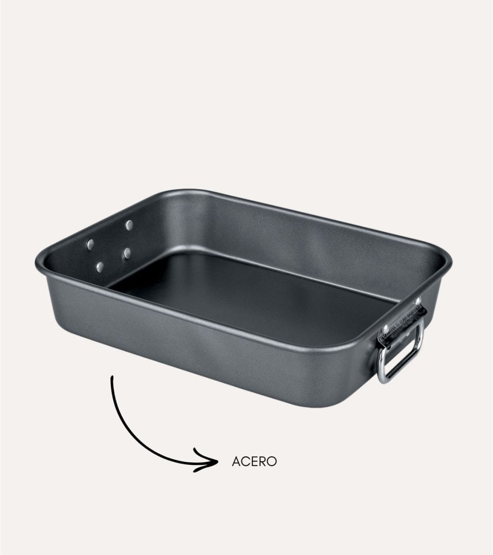 Esta bandeja de horno con asas abatibles está fabricada con un molde de acero de 0,4 mm, tratado con un antiadherente «LifeStyle» tanto en el interior como en el exterior. Este antiadherente es muy resistente y libre de PFOA, lo que garantiza una cocción segura y saludable. La bandeja puede soportar una temperatura máxima de 260 ºC en hornos domésticos. Sus medidas son 28 x 21 x 5 cm, lo que la hace perfecta para cualquier tipo de receta.