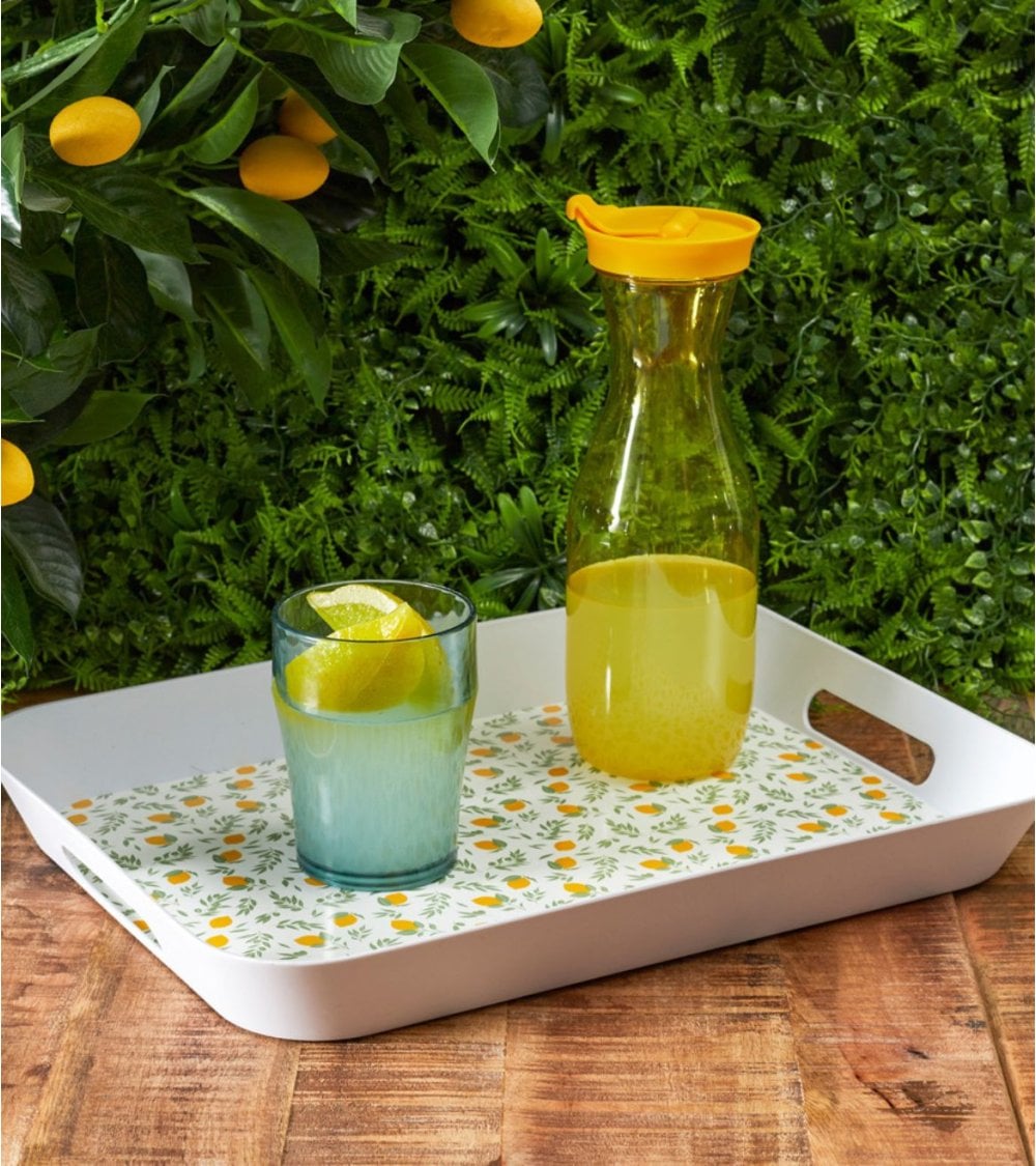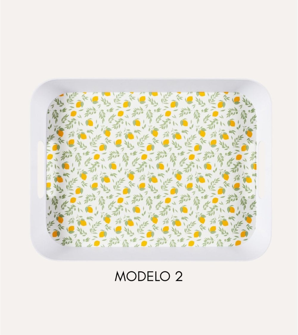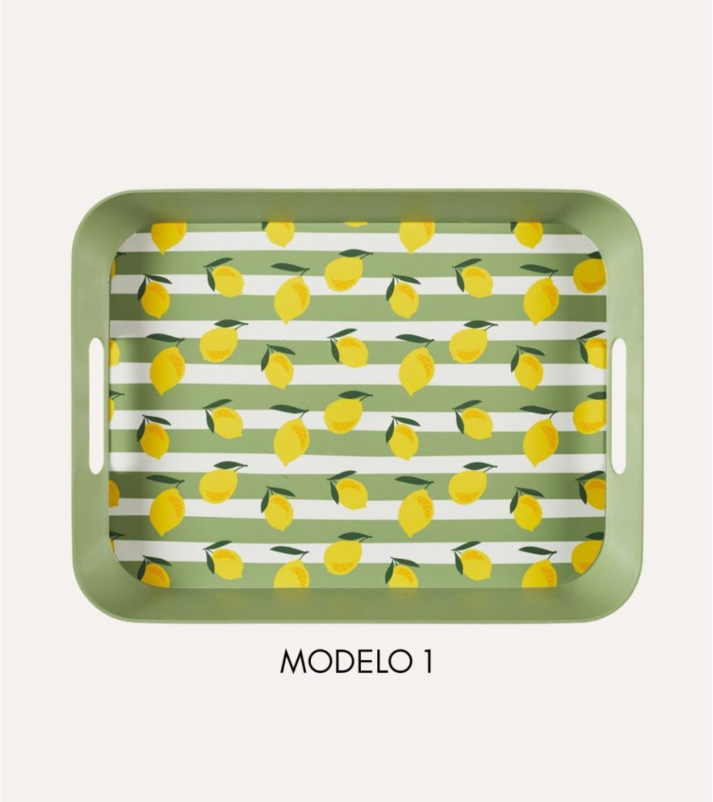El estampado exclusivo presenta pequeños limones amarillos acompañados de hojas verdes y detalles florales que evocan frescura y naturaleza. Además, cuenta con prácticas asas integradas en los laterales que permiten un agarre cómodo y seguro, haciendo que transportar la bandeja sea sencillo incluso cuando está cargada.