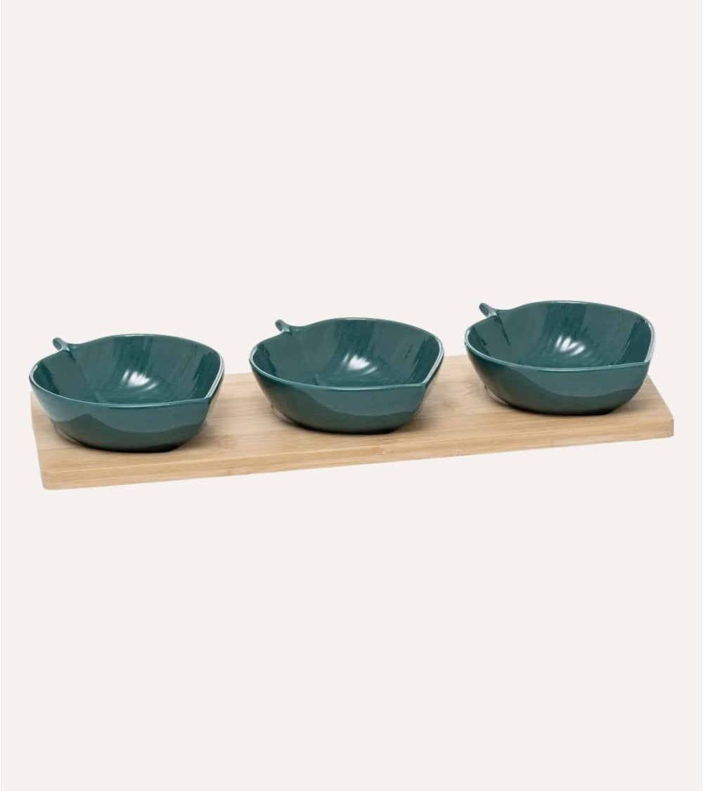 Este set de 3 mini bandejas de hojas azules para aperitivos está elaborado en cerámica resistente con un acabado brillante en un profundo tono azul. Su diseño único, inspirado en la belleza orgánica de las hojas, presenta una forma curvada y texturizada. Cada bandeja cuenta con un pequeño mango integrado que facilita su manejo y servicio. Se presentan sobre una base rectangular de bambú ecológico, que proporciona estabilidad y añade un toque cálido gracias a su acabado suave y la belleza del grano natural. Son perfectas para servir aperitivos, tapas o pequeños postres en cualquier tipo de evento. Tamaño: 32 x 11,5 x 1 cm.