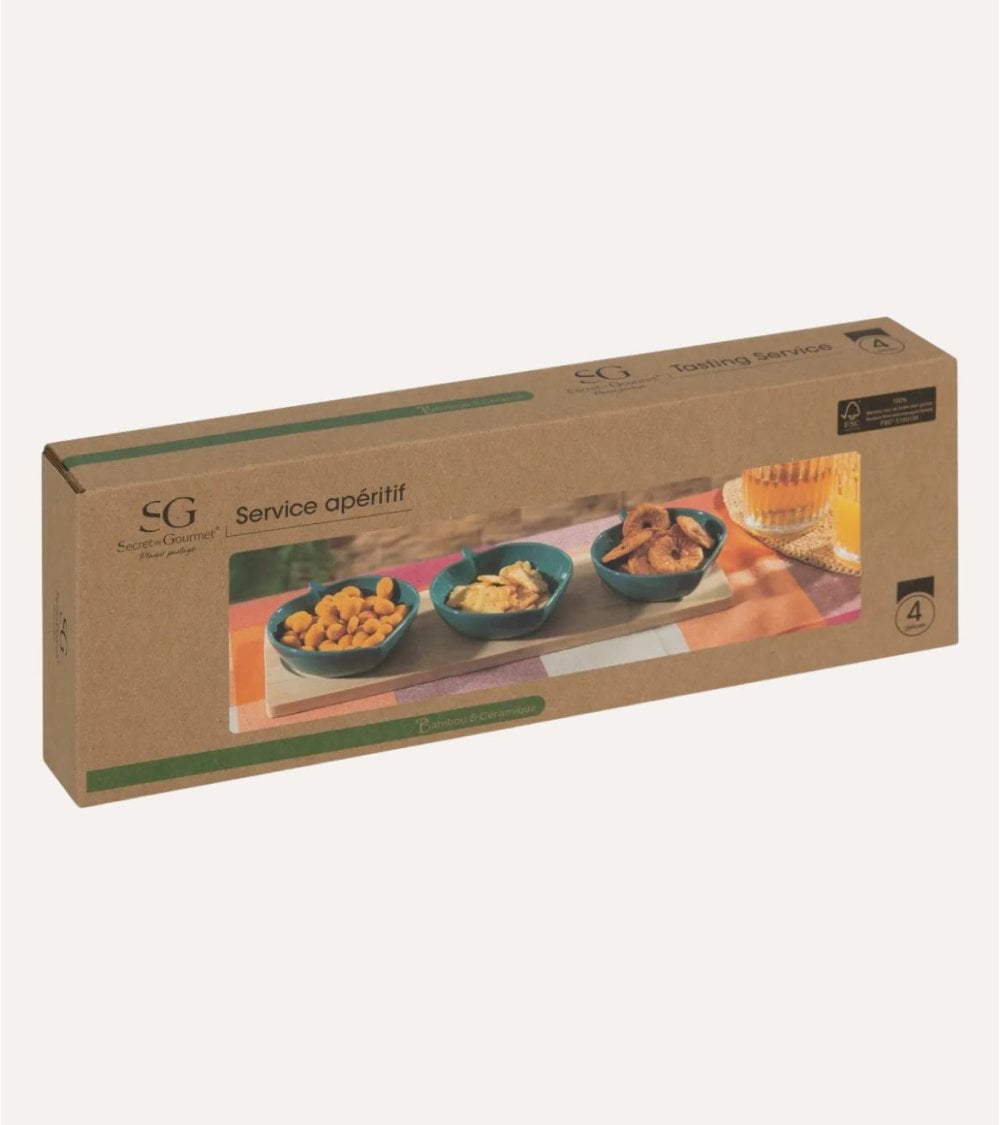 El set se presenta sobre una base rectangular hecha de bambú, que no solo proporciona estabilidad, sino que también añade un toque cálido gracias a su acabado suave y la belleza del grano natural. Esta combinación de materiales asegura durabilidad sin sacrificar el estilo.