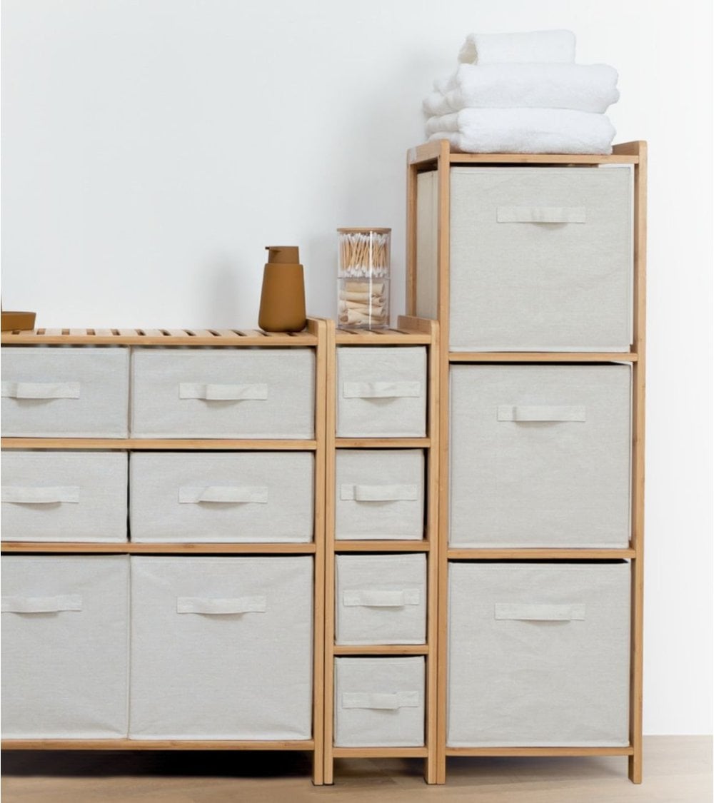 Descubre la estantería para baño Tidy Box con 4 cestas de bambú, una solución práctica y elegante para mantener tu baño organizado y con estilo. Este mueble vertical combina la resistencia natural del bambú con la suavidad y funcionalidad de las cestas de poliéster, ofreciendo un almacenamiento eficiente sin sacrificar el diseño.