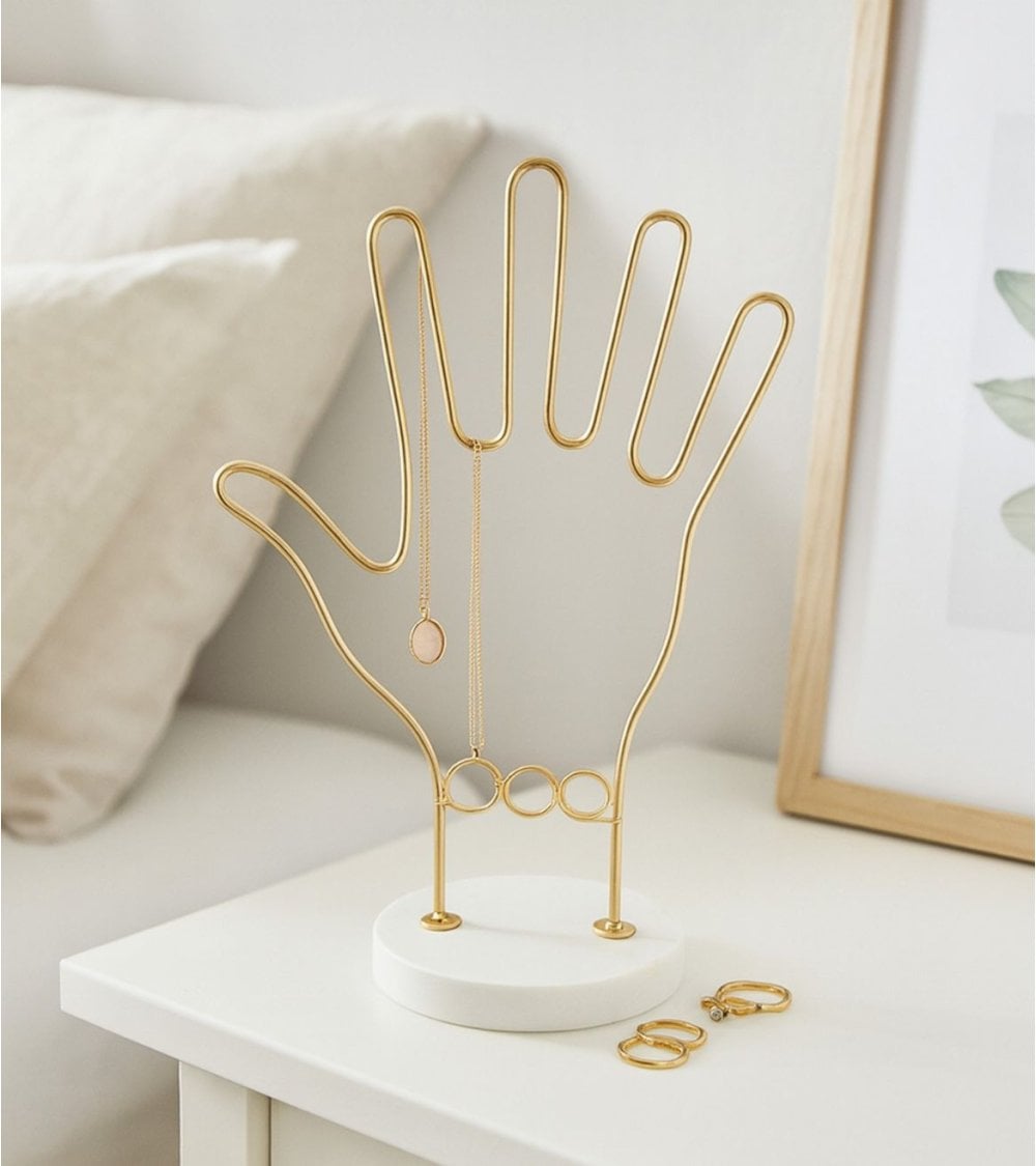 Este joyero destaca por su estructura en forma de mano abierta, elaborada con un fino alambre metálico acabado en tono dorado o latón que aporta un toque contemporáneo y elegante a cualquier espacio. La base circular está hecha de piedra blanca mate, que no solo garantiza estabilidad sino que también crea un contraste visual atractivo con el metal brillante.