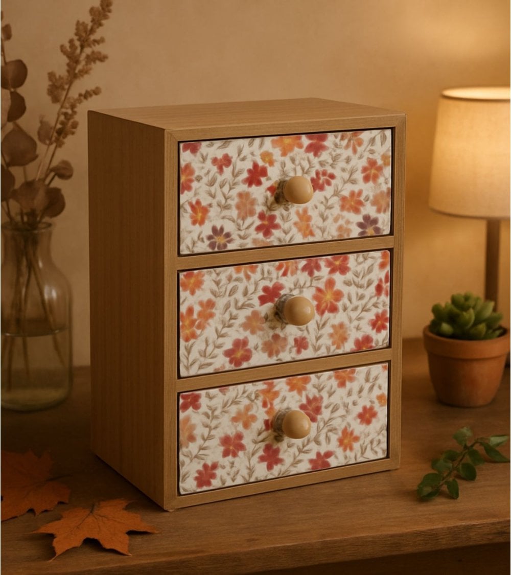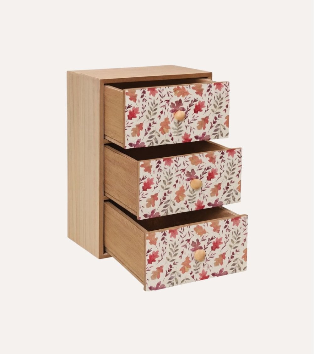 Con tres cajones espaciosos, el Joyero Aia ofrece múltiples compartimentos para organizar anillos, pulseras, collares y otros accesorios personales. Cada cajón desliza suavemente gracias a su diseño cuidado, facilitando el acceso rápido a tus objetos favoritos.
