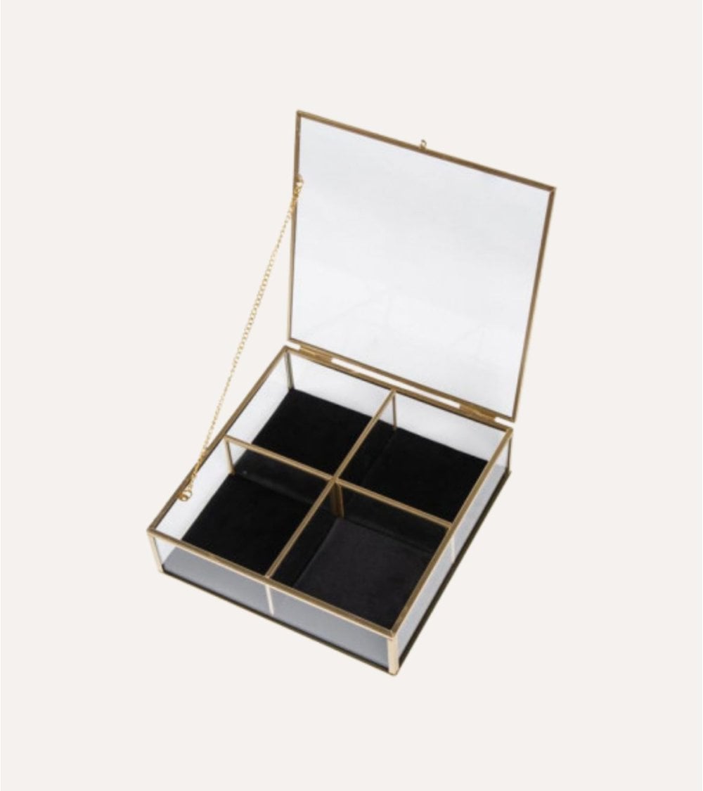 El Joyero Victoria con 4 compartimientos de cristal es perfecto para organizar tus joyas y accesorios pequeños. Su diseño rectangular y tapa abatible de cristal facilita el acceso rápido a tus piezas favoritas. Los compartimientos están diseñados para proteger tus joyas, evitando enredos y arañazos. La base interior en tono oscuro resalta el brillo del metal y las piedras, aportando un toque de lujo discreto. El acabado metálico dorado aporta un aire sofisticado, ideal para interiores modernos o clásicos. Este joyero es un excelente regalo para ocasiones especiales. Su material principal es cristal de gran transparencia y fácil limpieza. Dimensiones: 20 x 20 x 6 cm.