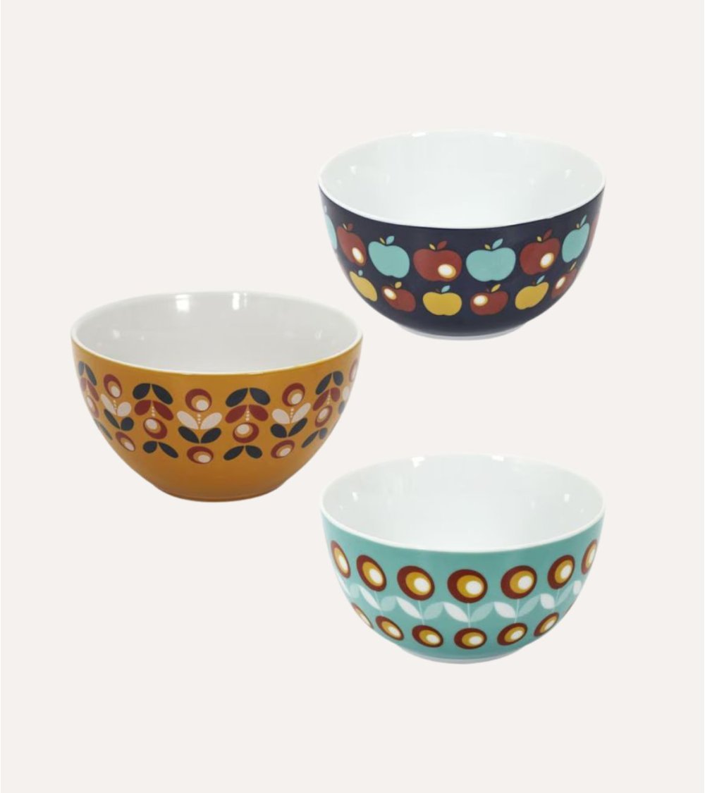 - Tres diseños exclusivos: amarillo floral, azul oscuro con manzanas, azul claro con círculos retro.
