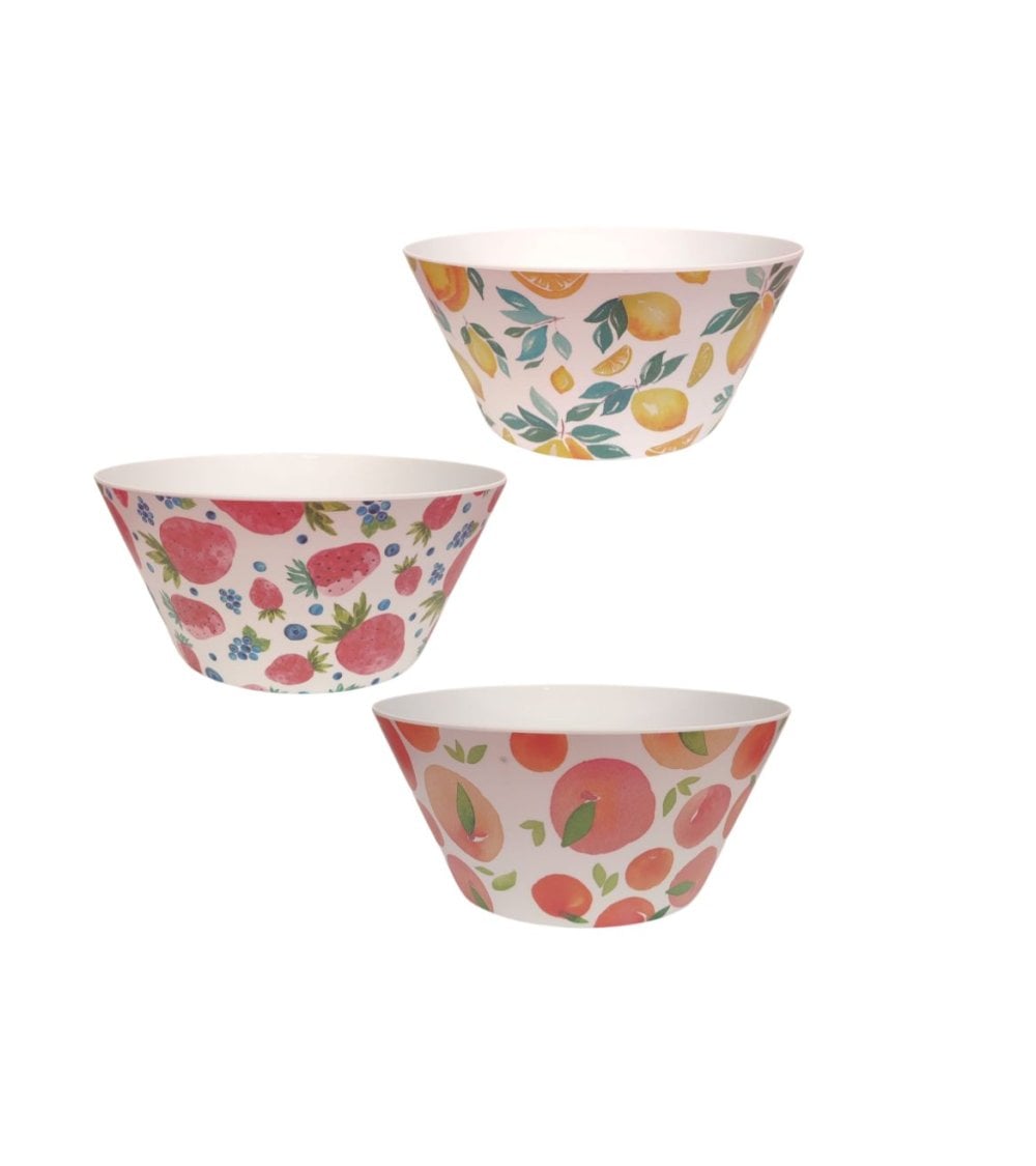 Bol y ensaladera de melamina con un bonito diseño de frutas de colores. Disponible en modelos surtidos.