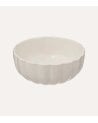 El diseño del cuenco presenta un cuerpo redondeado con una base profunda y ligeramente acampanada, mientras que el exterior está adornado con delicadas estrías verticales que aportan textura y un toque sofisticado. En contraste, el interior es completamente liso, pensado para servir alimentos cómodamente sin complicaciones.