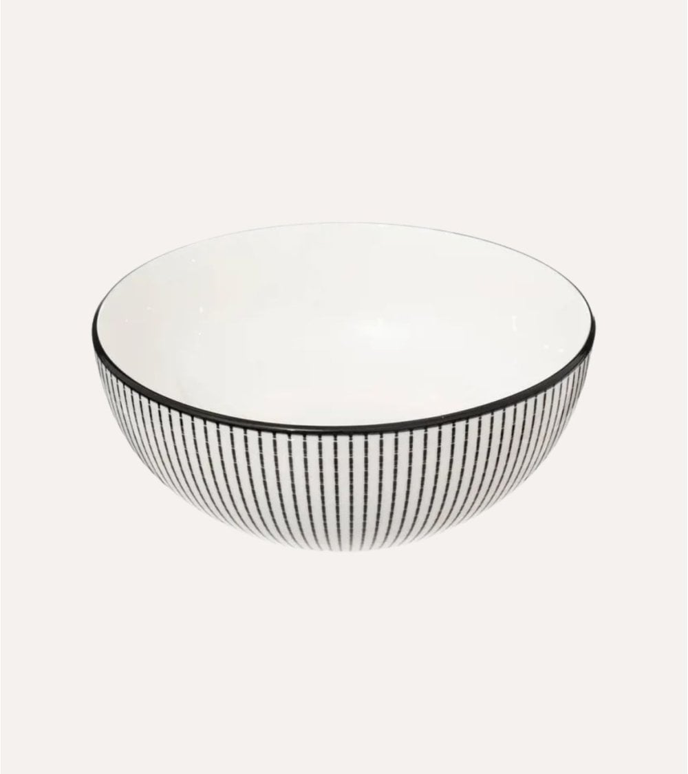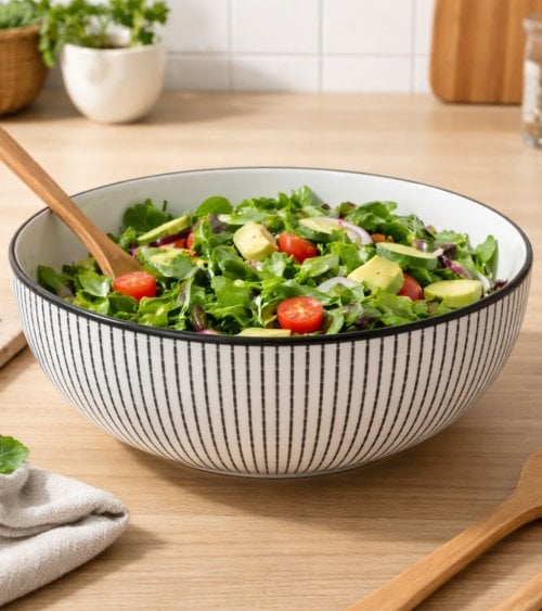 Su diseño minimalista con un patrón de líneas verticales negras sobre un fondo blanco aporta un toque moderno y sofisticado a cualquier mesa. La combinación del interior blanco con el exterior decorado crea un contraste visual atractivo que realza la presentación de tus ensaladas, pastas o snacks favoritos.