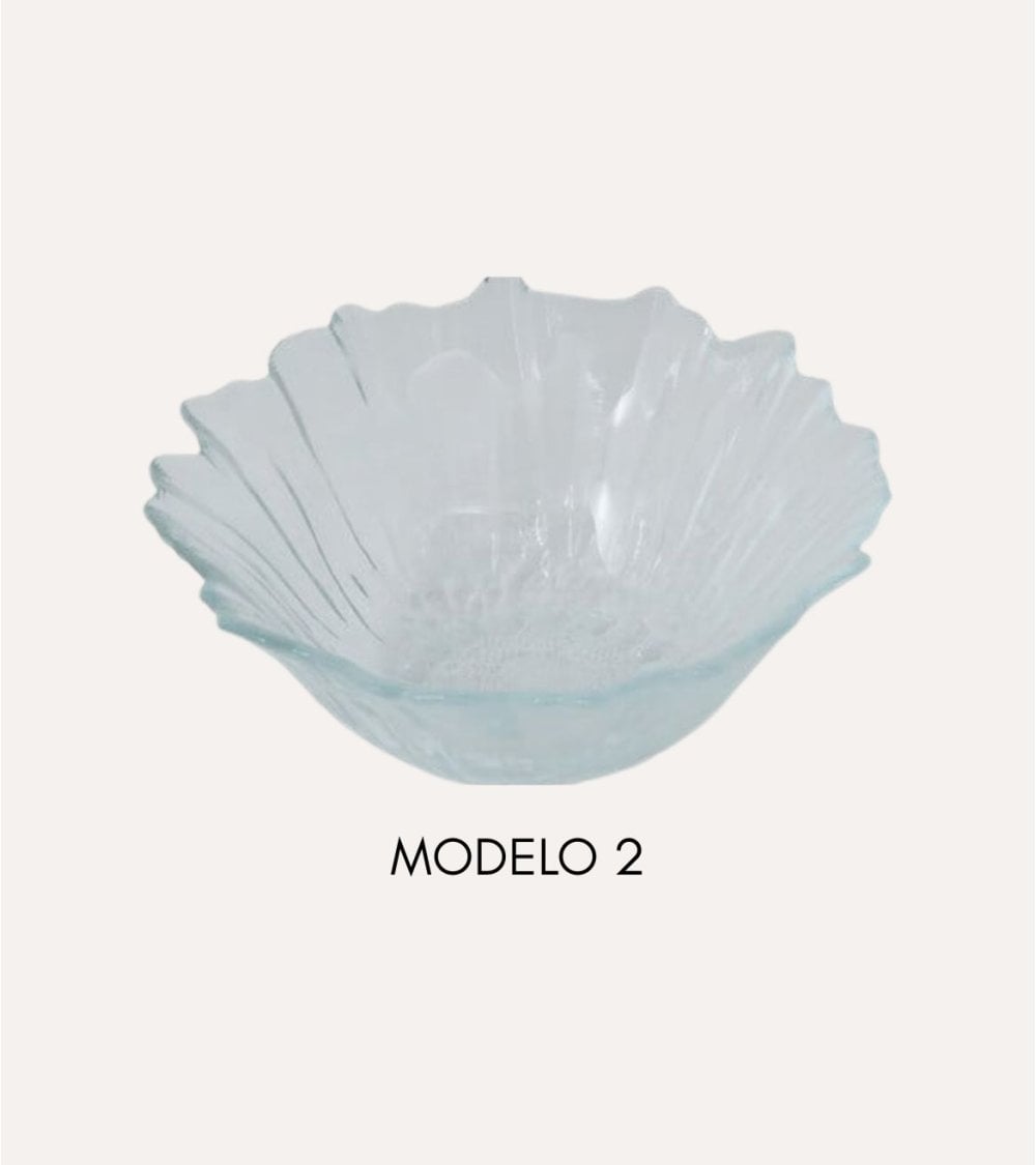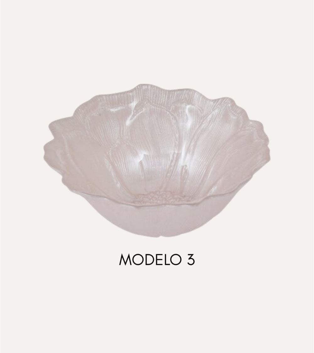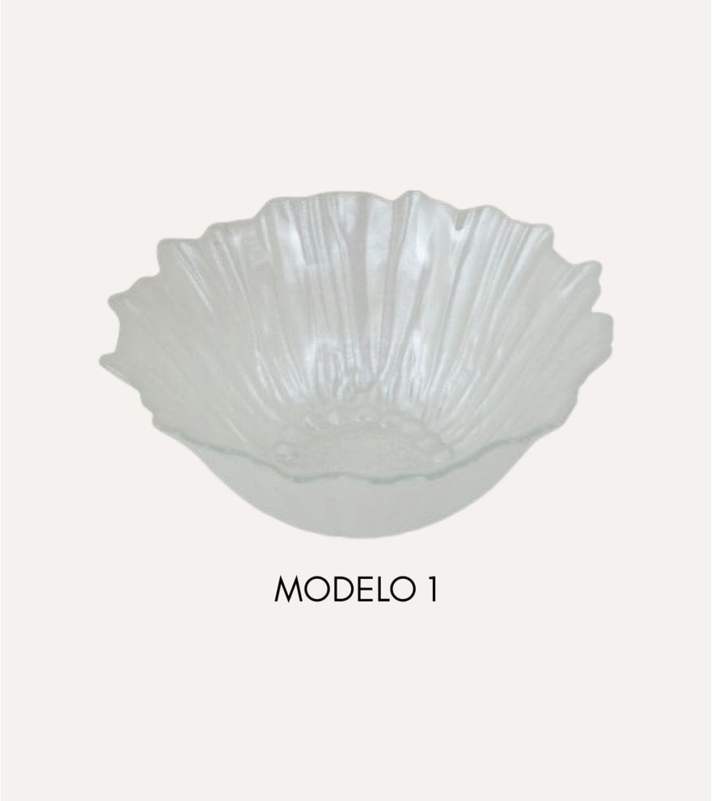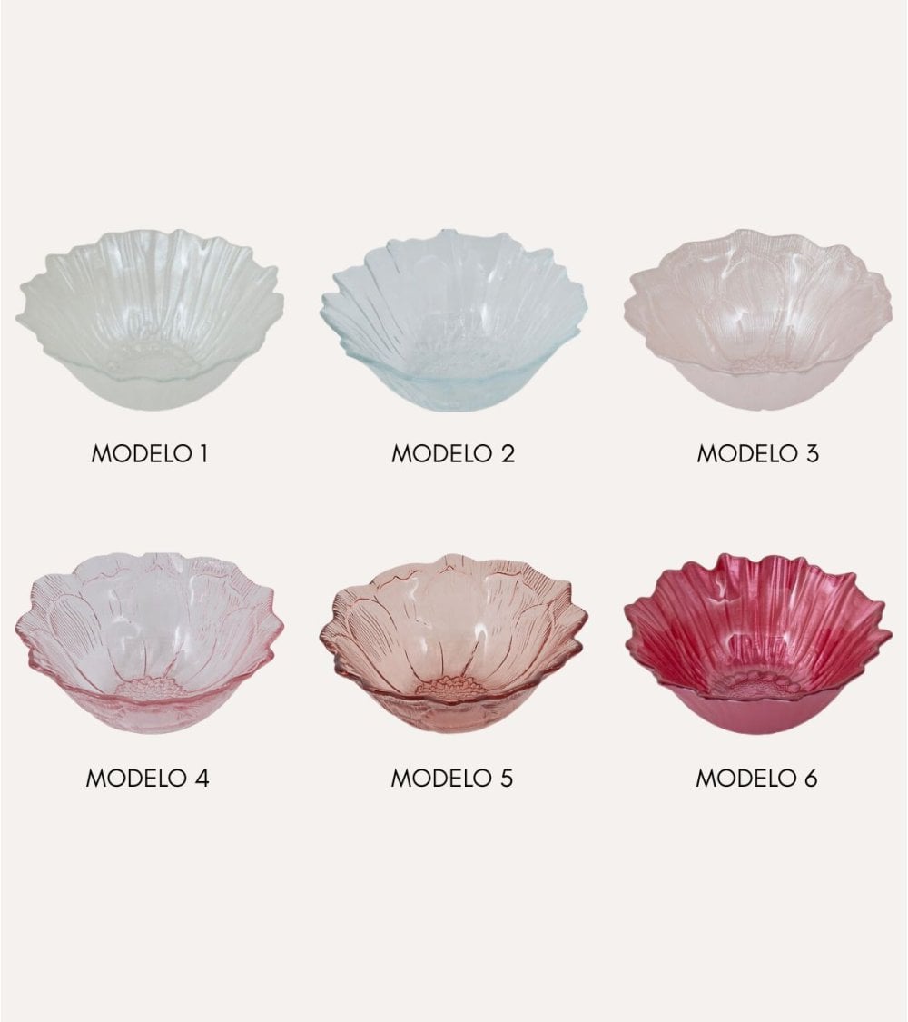 Su silueta ondulada, inspirada en delicados pétalos, crea un efecto visual que juega con la luz y el color, haciendo que cada variación destaque por su personalidad. Dispones de diferentes modelos y tonos, desde el cristal completamente transparente hasta matices en azul, rosa claro, rosa intenso y rojo vibrante. Estas variaciones permiten crear composiciones únicas: puedes combinar varios cuencos de distinto color para un look festivo, o elegir un solo tono para una mesa más sofisticada y armoniosa.