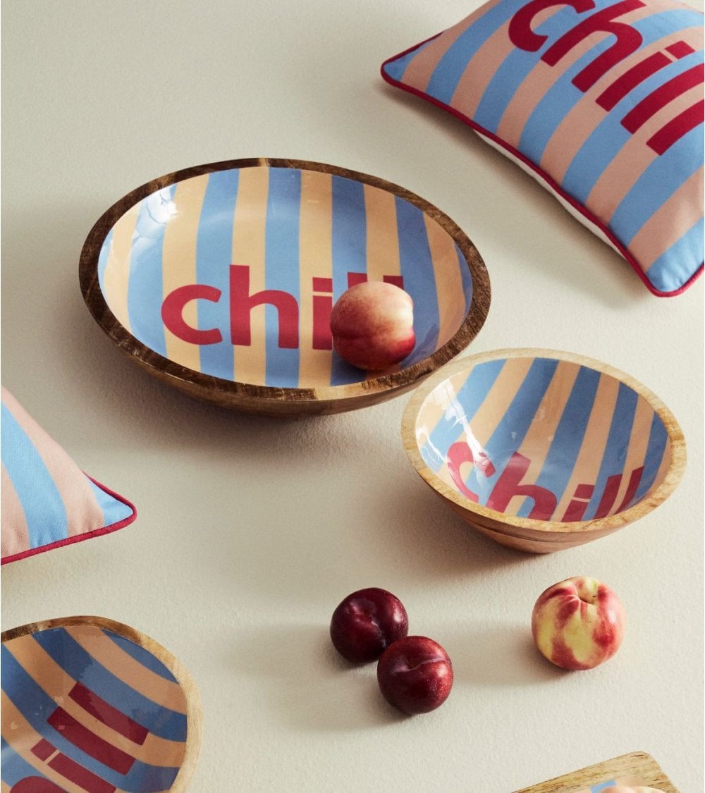 En la parte exterior, la madera luce un acabado suave que realza los matices marrones del material, mientras que el interior incorpora un diseño contemporáneo con franjas de color que aportan frescura y un contraste muy decorativo. Esta combinación convierte al bol en una pieza ideal tanto para usar a diario como para lucirlo como elemento decorativo sobre una mesa de centro, aparador o encimera de cocina.