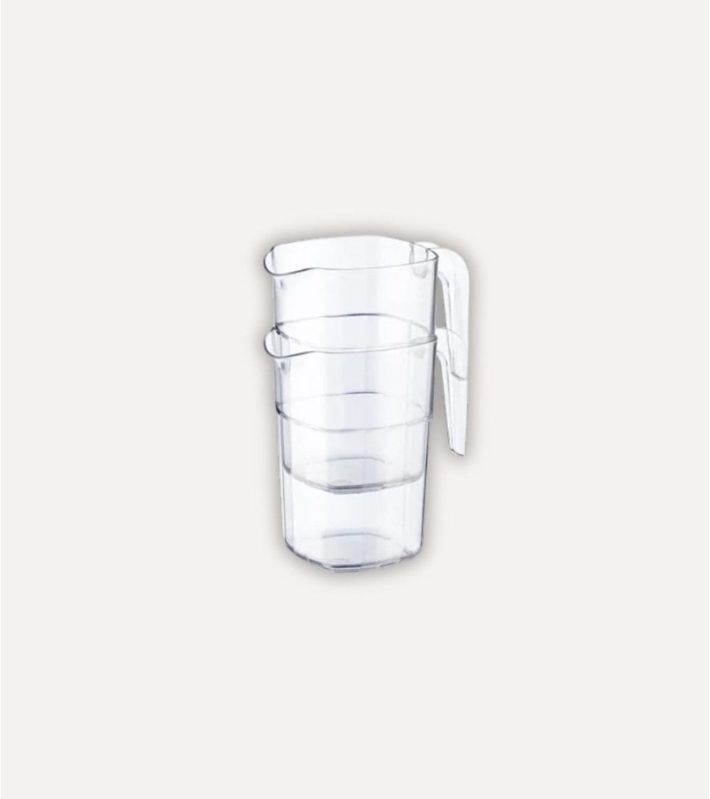 Material: Plástico transparente duradero con tapa opaca blanca. Diseño apilable: Forma cuadrada que permite ahorrar espacio al almacenar varias jarras. Mango ergonómico: Facilita el agarre cómodo y seguro durante el uso.