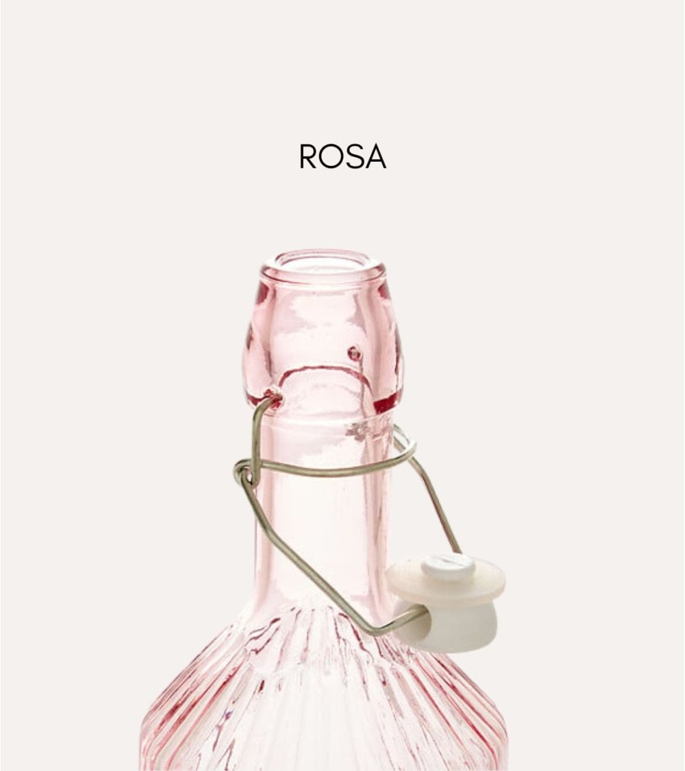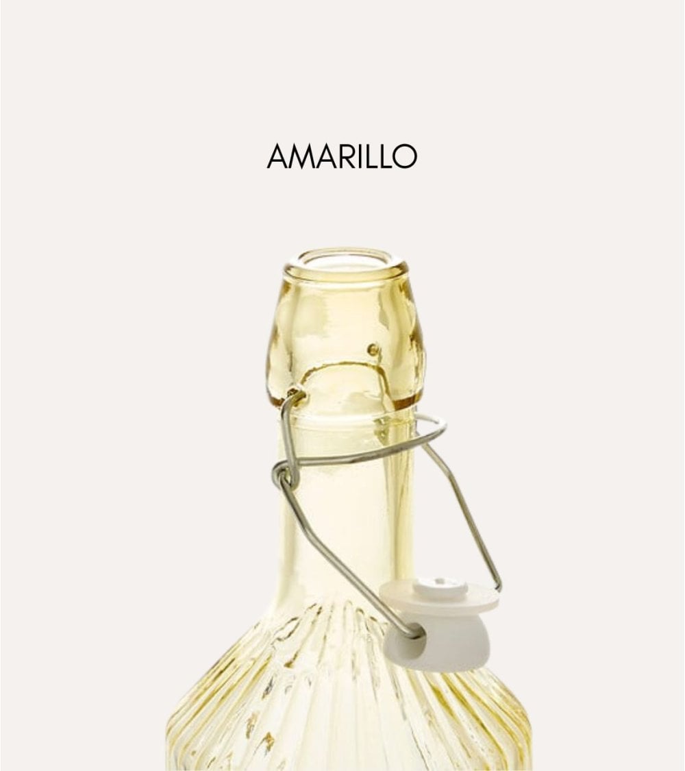 La Botella Limonada Line de Vidrio Tintado destaca por su diseño con líneas verticales que no solo realzan su belleza visual sino que también ofrecen un agarre cómodo y seguro. Su cierre metálico tipo flip-top garantiza una conservación óptima del contenido, evitando derrames y manteniendo la frescura de tus líquidos.