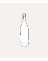 Esta botella de limonada de vidrio presenta una forma clásica y alargada, estrechándose hacia el cuello y ensanchándose en la base. Tiene una capacidad de 500 ml o 1 litro. Su color transparente permite ver el contenido con claridad. Fabricada en vidrio duradero, proporciona una sensación premium. La tapa cuenta con un tapón cerámico o plástico blanco, asegurado por un cierre de alambre metálico, típico del diseño swing-top.